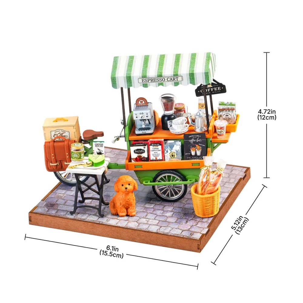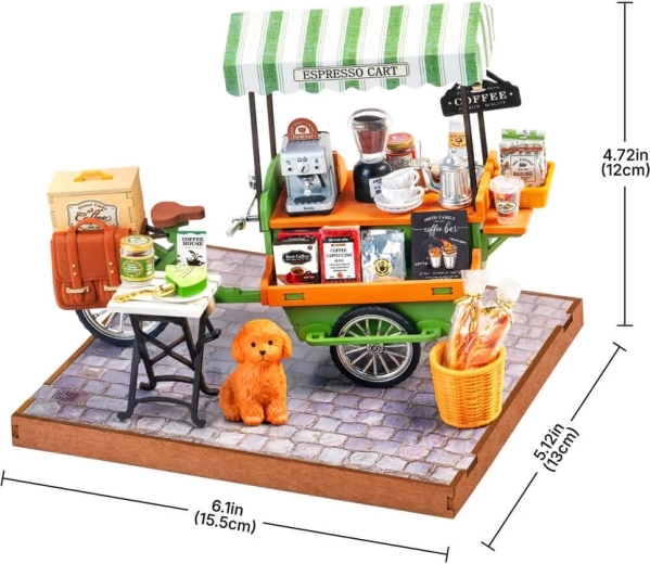 Részletes kávégép, csészék, kávés tasakok, asztalka és egy bájos kiskutya – mindez a valódi utcai kávézó hangulatát idézi meg a modellben.