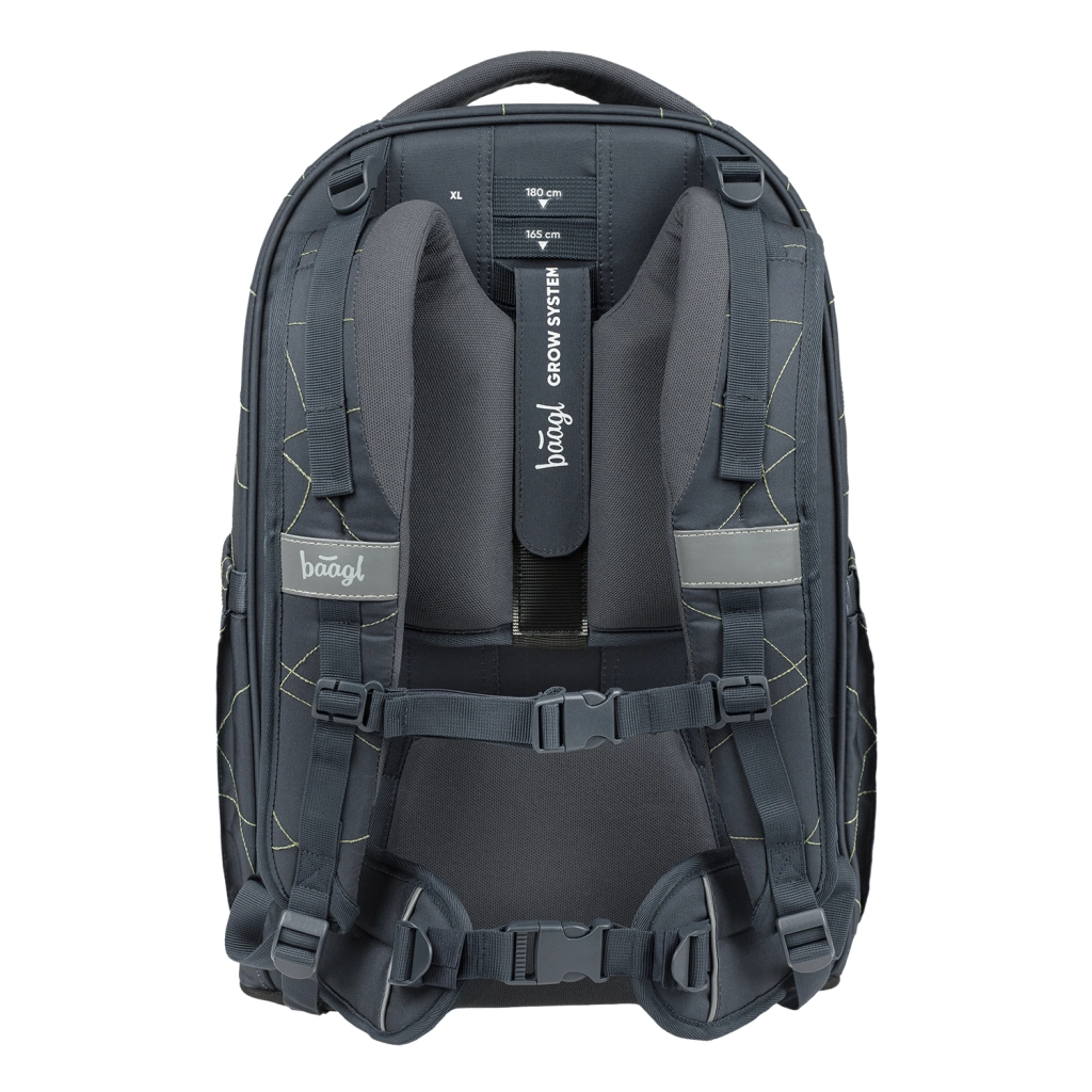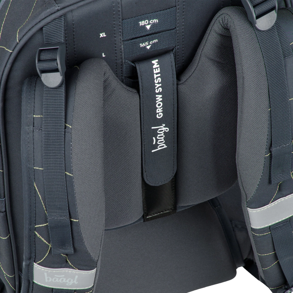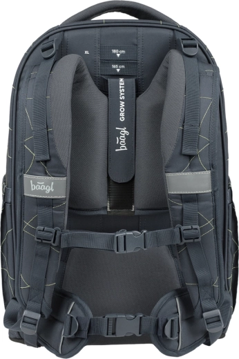 A BAAGL Skate Max Wave GRS átgondolt hátizsák 135–185 cm magas tanulók számára. A csúsztatható hátrendszernek köszönhetően akár négy méretben együtt nő a gyerekkel. Az EVA merevítésű konstrukció kiválóan tartja a formát, a levehető derékpánt növeli a stabilitást, az ergonomikusan formázott, finom hálós pántok pedig kímélik a nyak környékét.