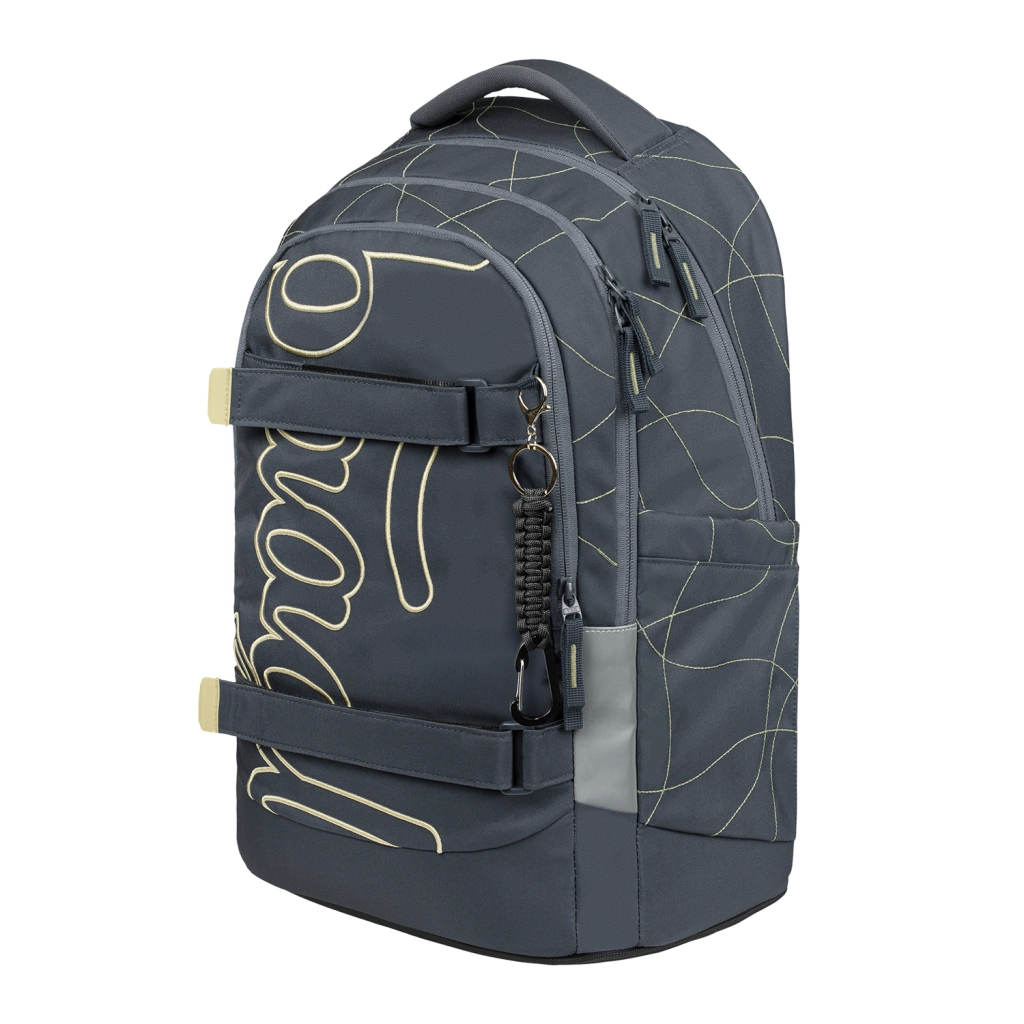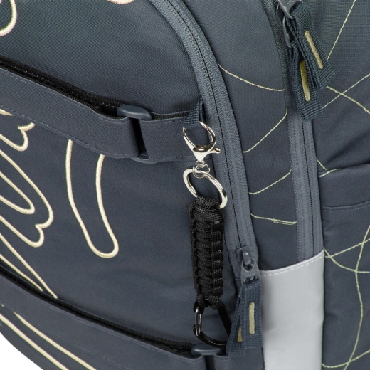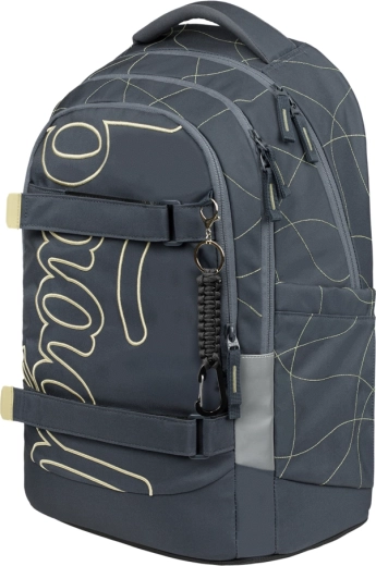 A belső teret háromrekeszes rendező és bársony bélésű laptopzseb alkotja, amely megóvja az elektronikát a karcolódástól. A masszív oldalzsebek elférnek a tritán BAAGL kulacsok számára, az elülső kompressziós pánt pedig megtartja a pulóvert vagy a gördeszkát, a stílusos függő pedig egyedi megjelenést ad a hátizsáknak.