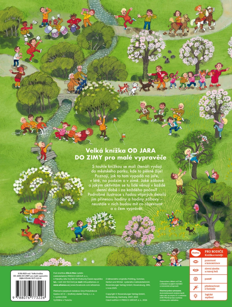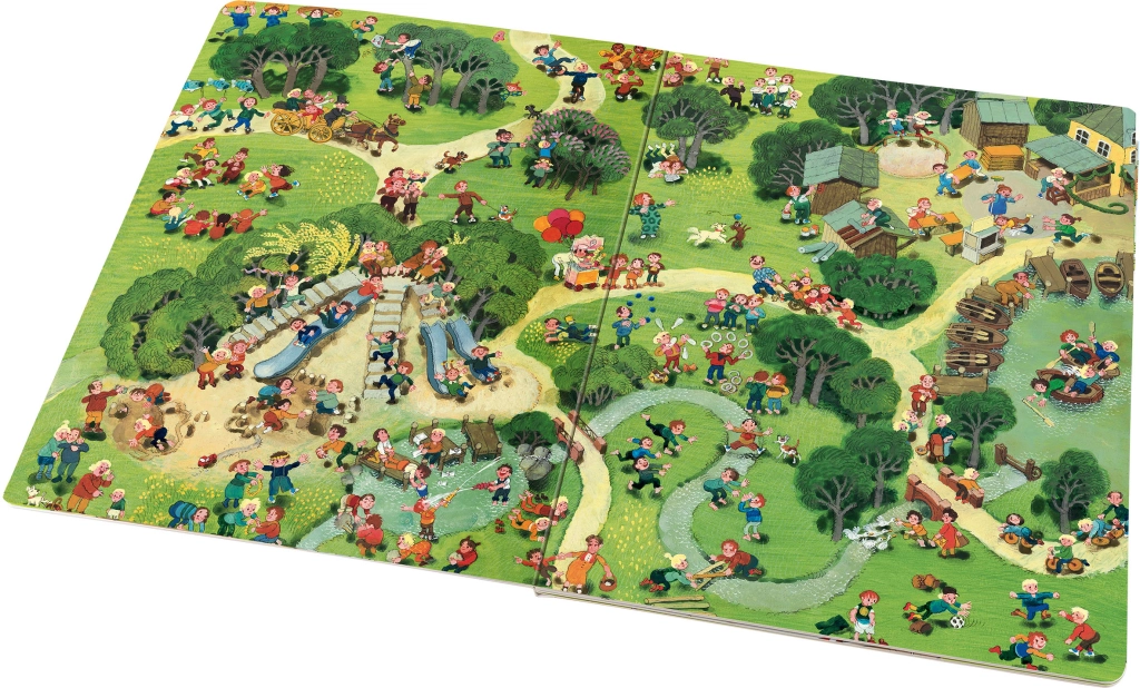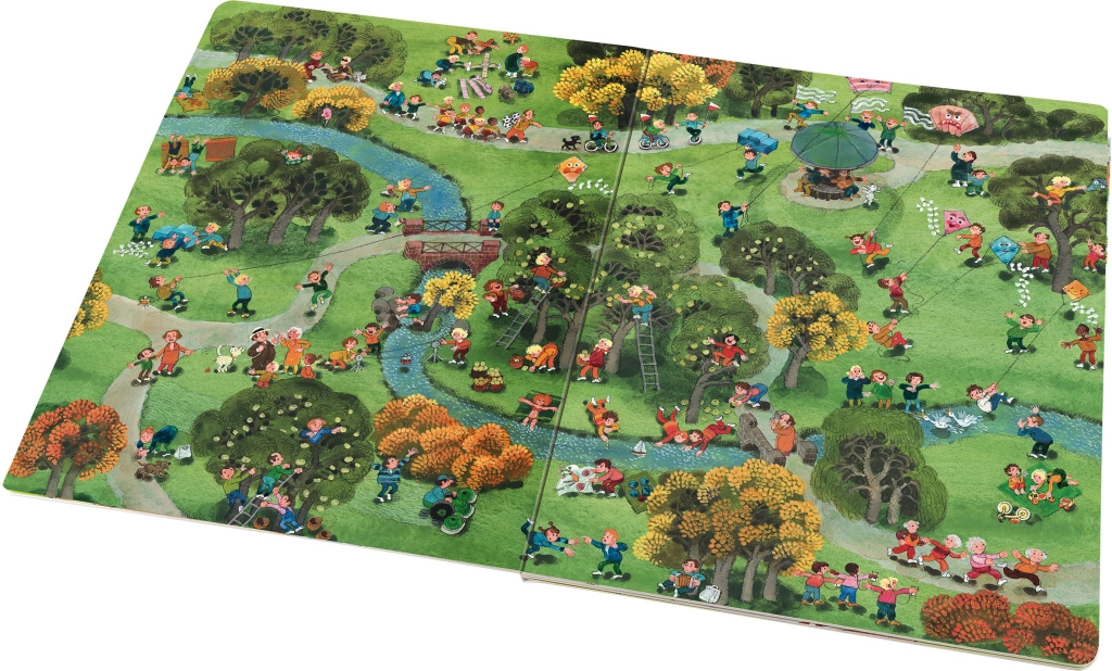 Ez a nagy alakú képeskönyv négy évszakon – tavasz, nyár, ősz és tél – át vezeti végig a gyerekeket egy nyüzsgő városi parkon. Minden oldal tele van apró történetekkel, tevékenységekkel és szereplőkkel, amelyek a napszaktól és az időjárástól függően változnak. A gazdag illusztrációknak köszönhetően a gyerekek folyamatosan új összefüggéseket fedeznek fel, és fejlesztik megfigyelőképességüket.