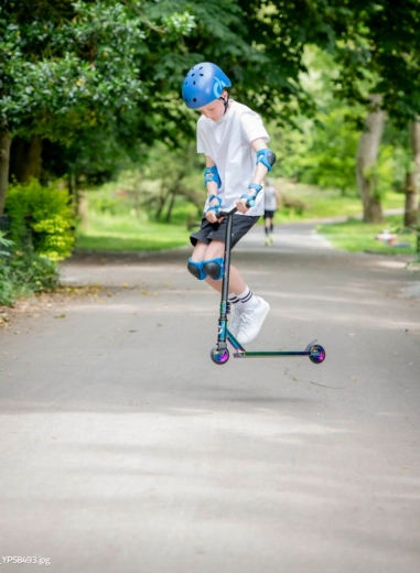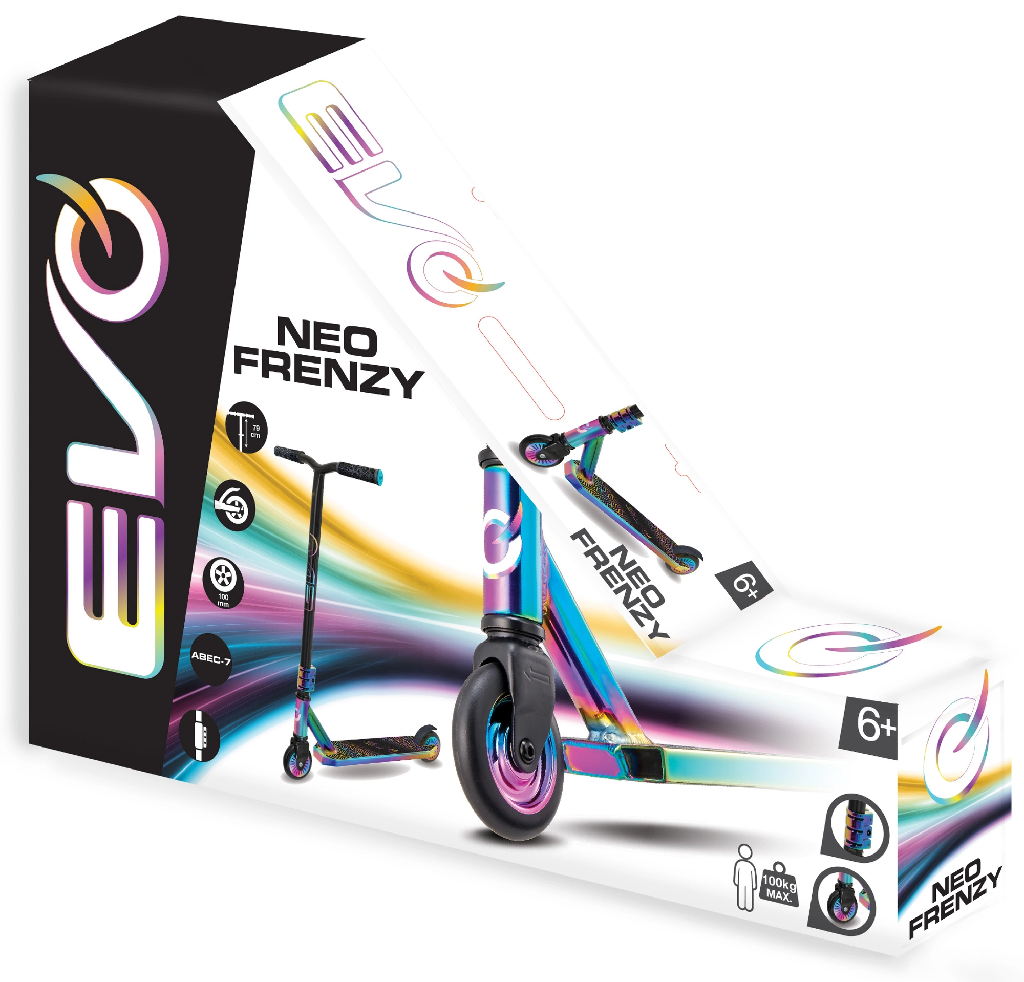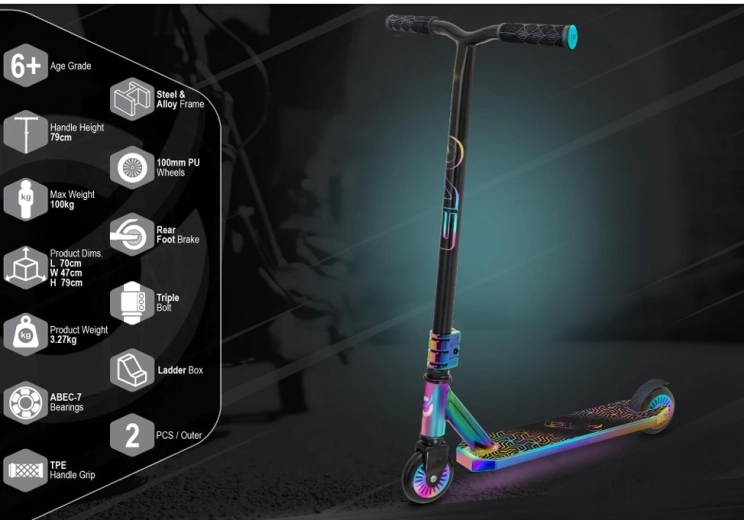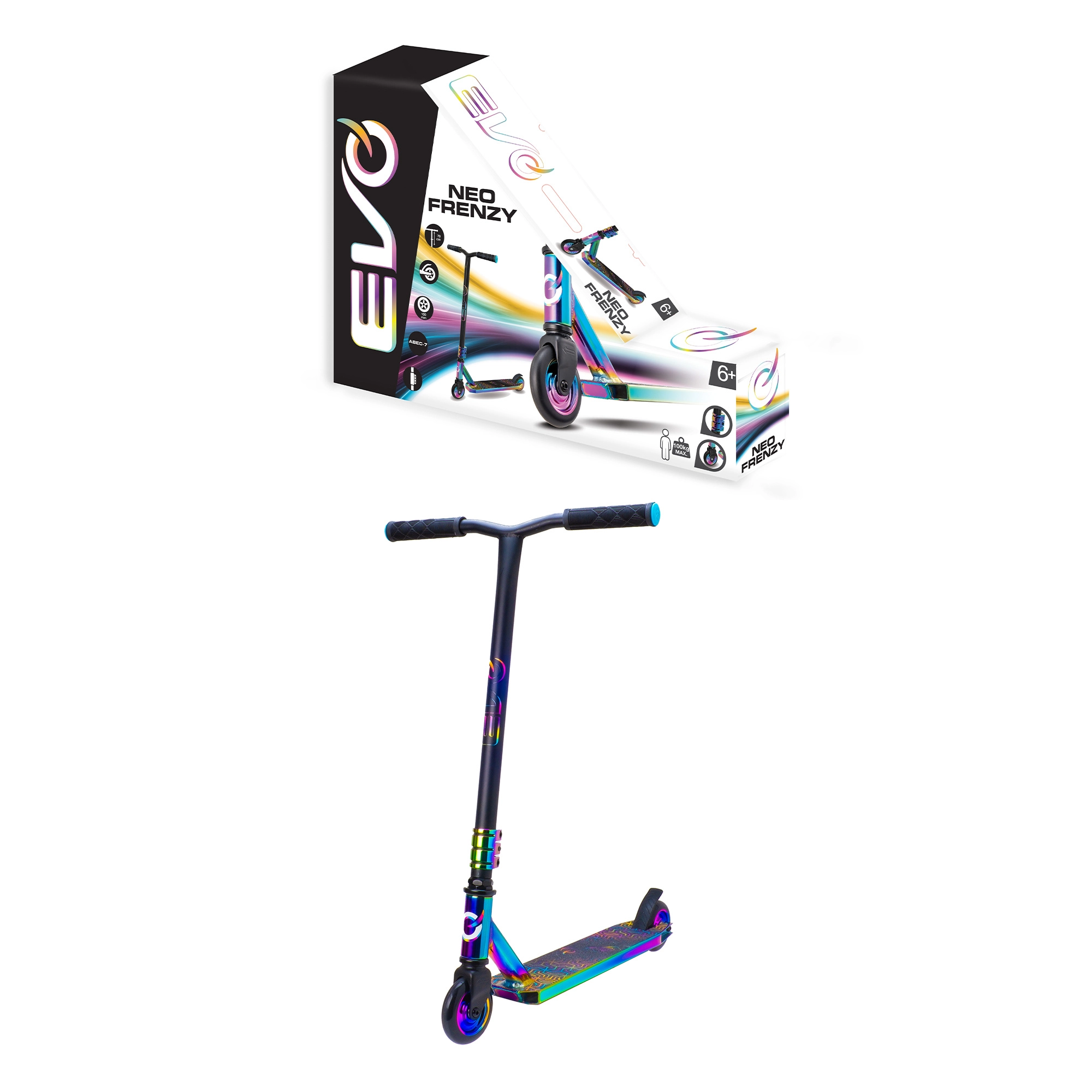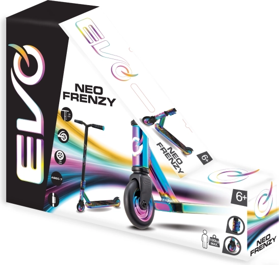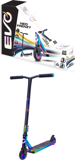 Az EVO Neo Frenzy egy gyerek stunt roller, amelyet az egyensúly tanulásához és az első trükkökhöz terveztek. A masszív fém deck csúszásgátló grip szalaggal és a strapabíró villa stabilitást nyújt, míg a kis, kemény kerekek ABEC-7 csapágyakkal gyors gyorsulást és sima haladást biztosítanak. A feltűnő neo-chrome részletek magukra vonják a figyelmet és egyedi stílust adnak a rollernek.