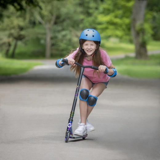 A fix T-bar kormány kb. 79 cm magassággal pontos irányítást kínál, a tripla bilincs növeli a szerkezet merevségét, a hátsó sárvédő/fék pedig biztonságos és intuitív megállást tesz lehetővé. A roller ideális kezdő ridereknek, akik már rendelkeznek alapvető tapasztalattal, és szeretnék fejleszteni tudásukat a skateparkban és sima városi felületeken.