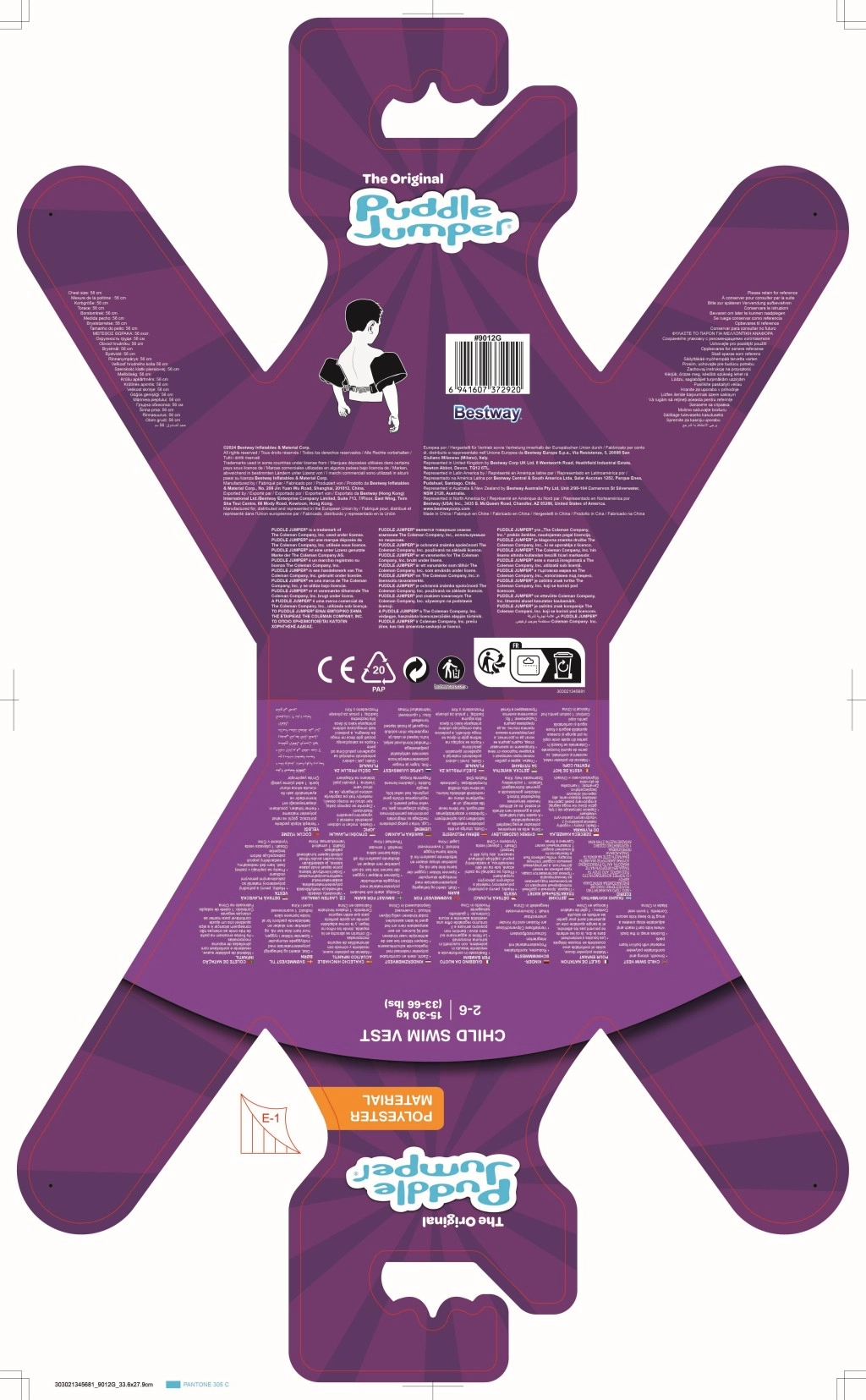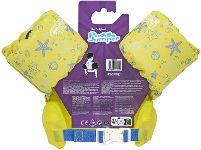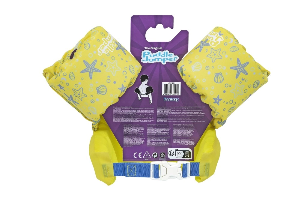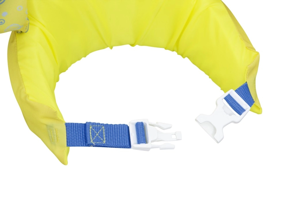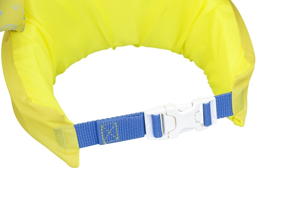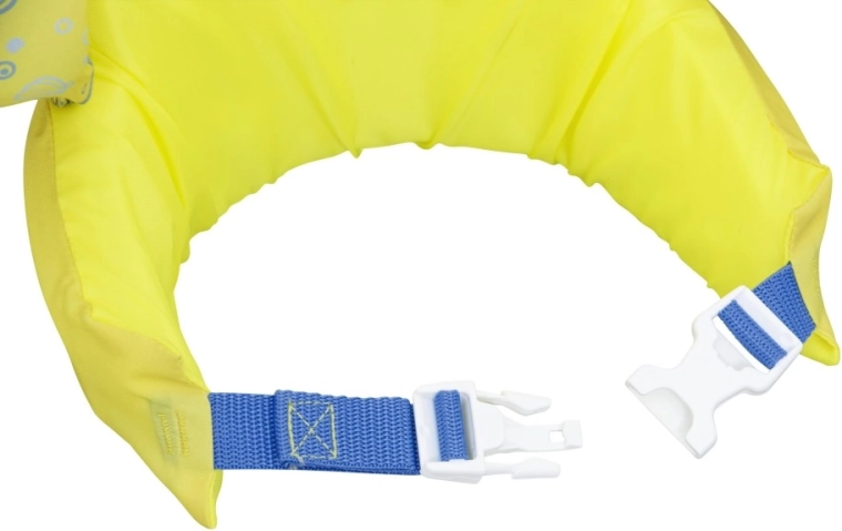 Az ujjak szorosan körbefogják a karokat és segítik a gyermek testhelyzetének stabilizálását, míg a hátsó csat állítható pánttal biztosítja a megbízható, véletlen kinyitás elleni rögzítést. A mellény könnyű, könnyen hordozható, víz- és napálló – ideális nyaraláshoz, kerti medencéhez és strandfürdőhöz.