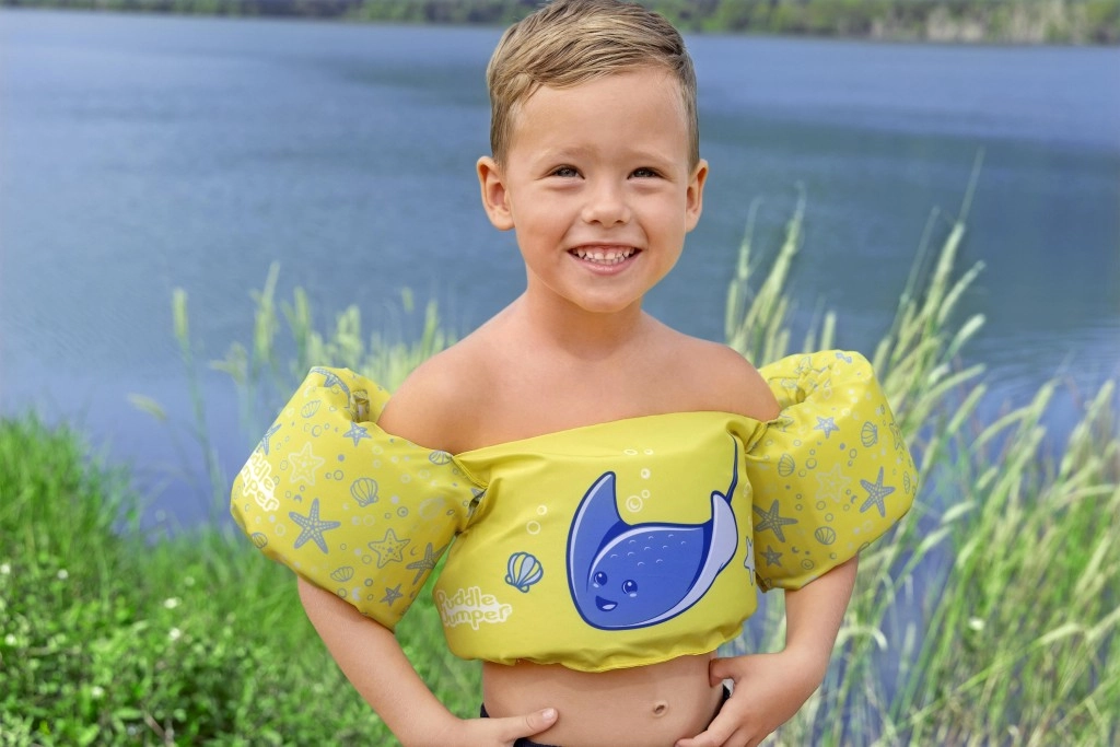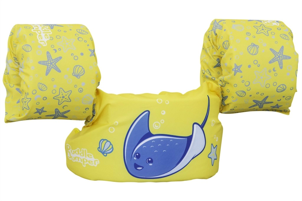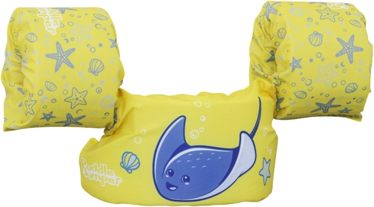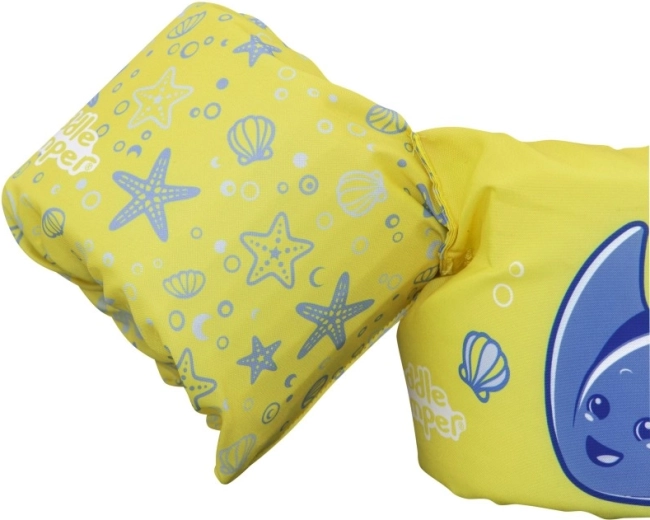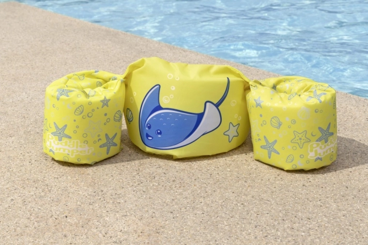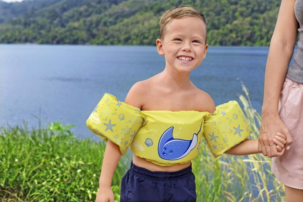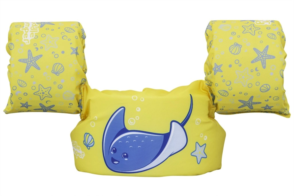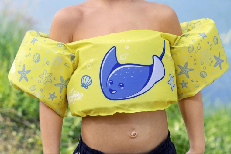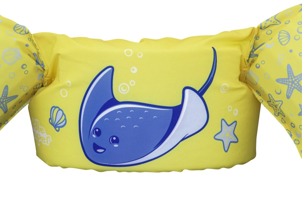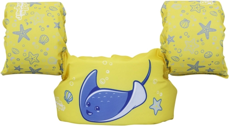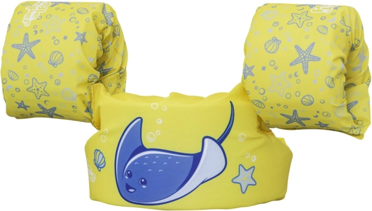 Könnyű és kényelmes gyerek úszómellény újjakkal 2–6 éves korra és 15–30 kg súlyra, amely megbízható felhajtóerőt, puha poliésztert és biztonságos, hátul záródó csatot kínál. Vidám sárga dizájn kék rájával, amely támogatja az önbizalmat az első úszási próbálkozásoknál medencében és természetes vizekben is.