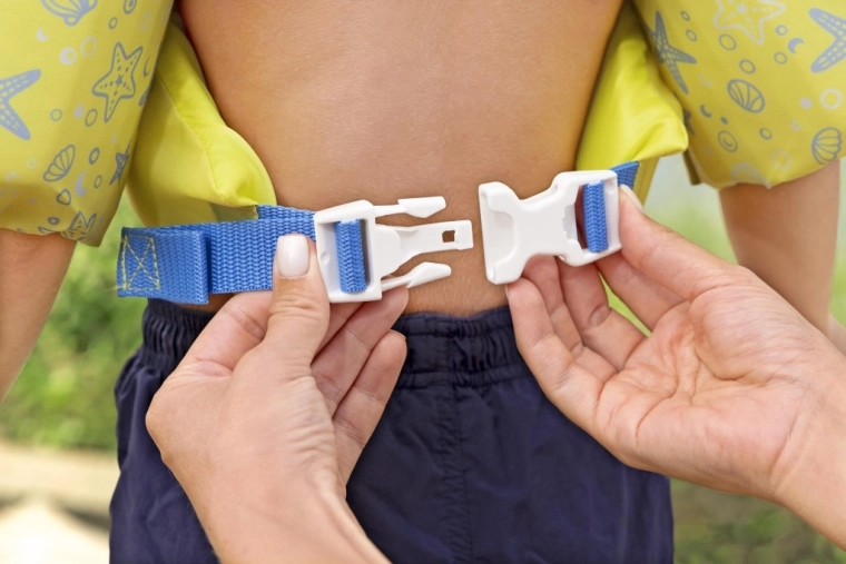 Az állítható kék pánt minőségi műanyag csattal szilárdan a helyén tartja a mellényt, és megakadályozza, hogy a gyermek véletlenül kinyissa.