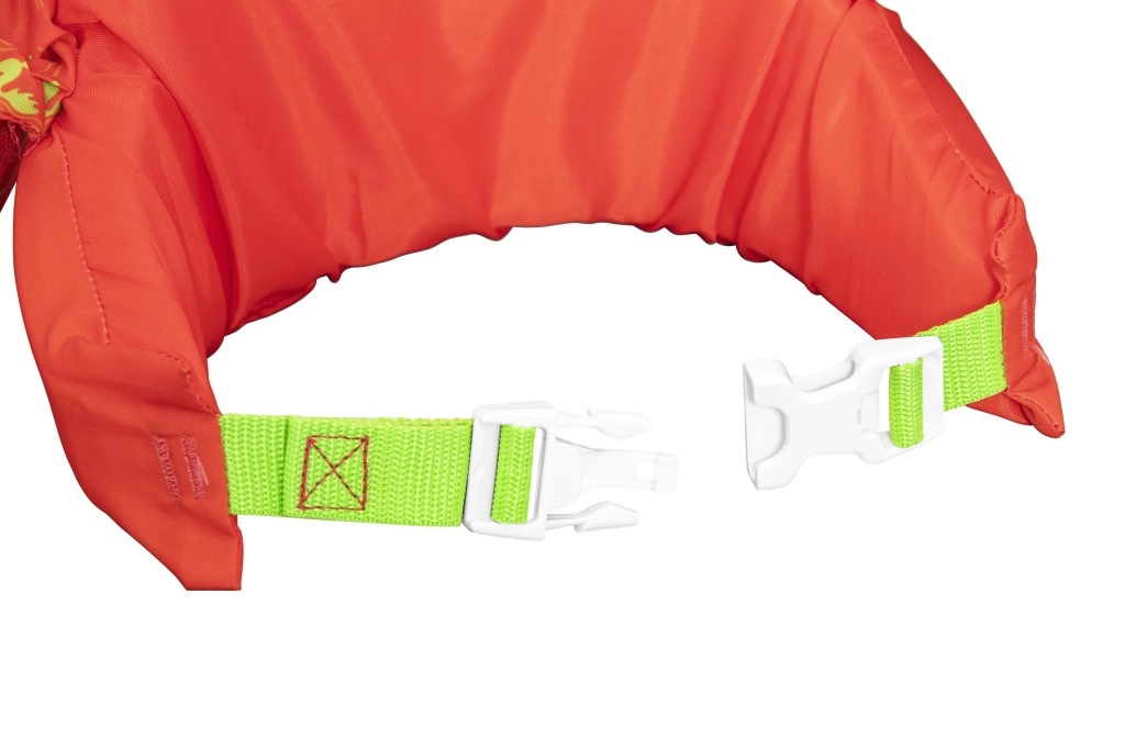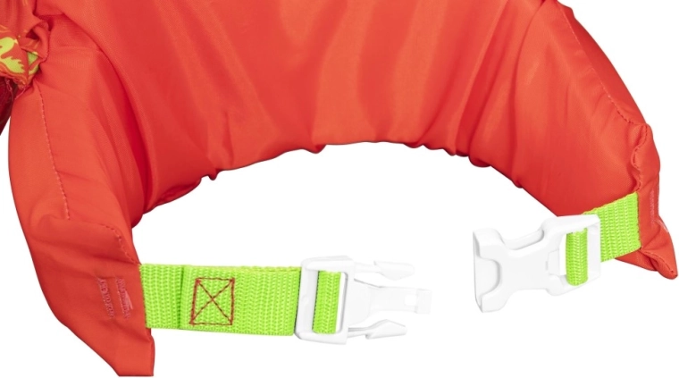 A tartós poliészter szövet kellemes tapintású, és a habbetétekkel kombinálva megbízható felhajtóerőt nyújt kényelmetlenség nélkül. A hátul található állítható pánt biztonsági csattal gondoskodik róla, hogy a mellény stabilan üljön, és a gyermek ne tudja magától kikapcsolni.