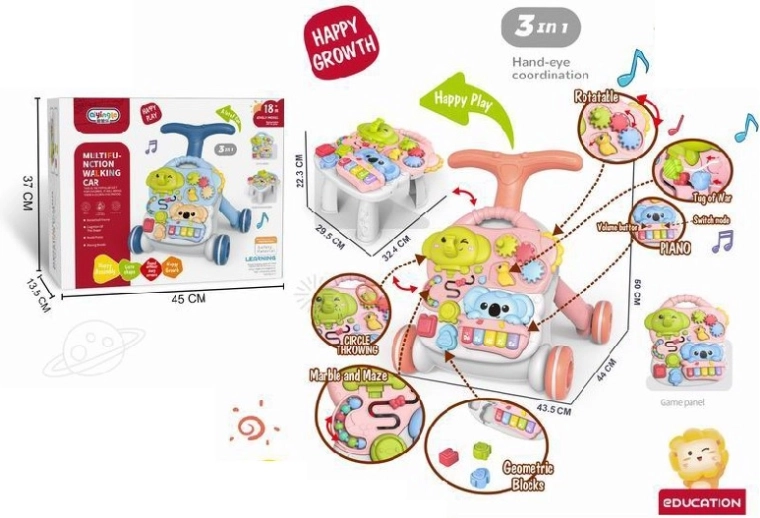 A 3 az 1-ben multifunkciós járássegítő és oktató asztal természetes módon támogatja a gyermek fejlődését 12 hónapos kortól. Kínál járássegítőt, asztalt és levehető interaktív panelt zongorával és olyan elemekkel, amelyek fejlesztik a motorikát, az érzékelést, valamint az alakok, színek és hangok felismerését. A stabil kialakításnak, a lábak vízzel vagy homokkal terhelhető lehetőségének és a csúszásgátló, fékezhető kerekeknek köszönhetően a játék biztonságos és egyenletes.
