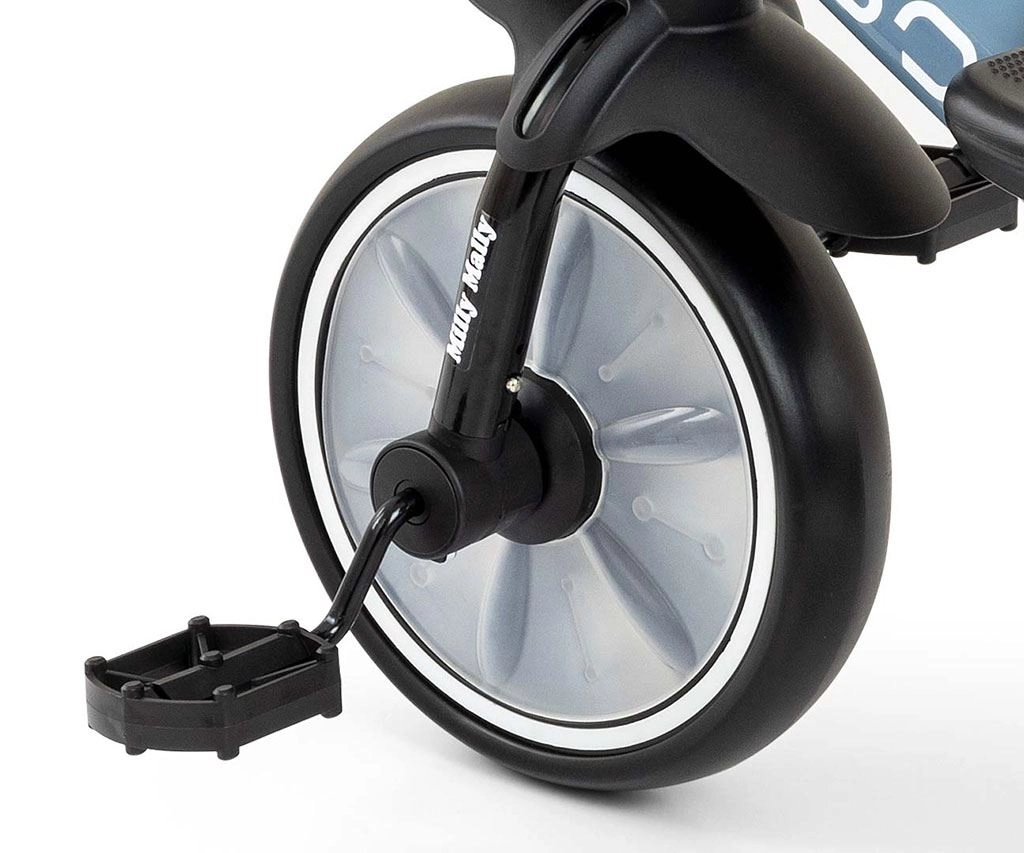 Az eltávolítható pedálok okos megoldása lehetővé teszi a használatot futóbicikliként és klasszikus háromkerekűként is. Az első kerék védelme megakadályozza a lábak becsípődését, a csúszásmentes, végzárós markolatok növelik a biztonságot, a sárvédő pedig véd a szennyeződésektől. A két kosár – elöl és hátul – helyet biztosít a játékoknak és apróságoknak.