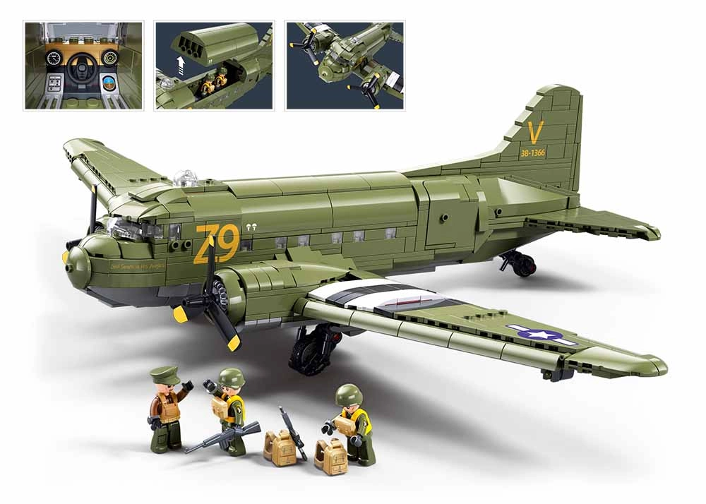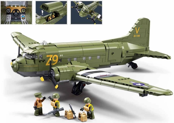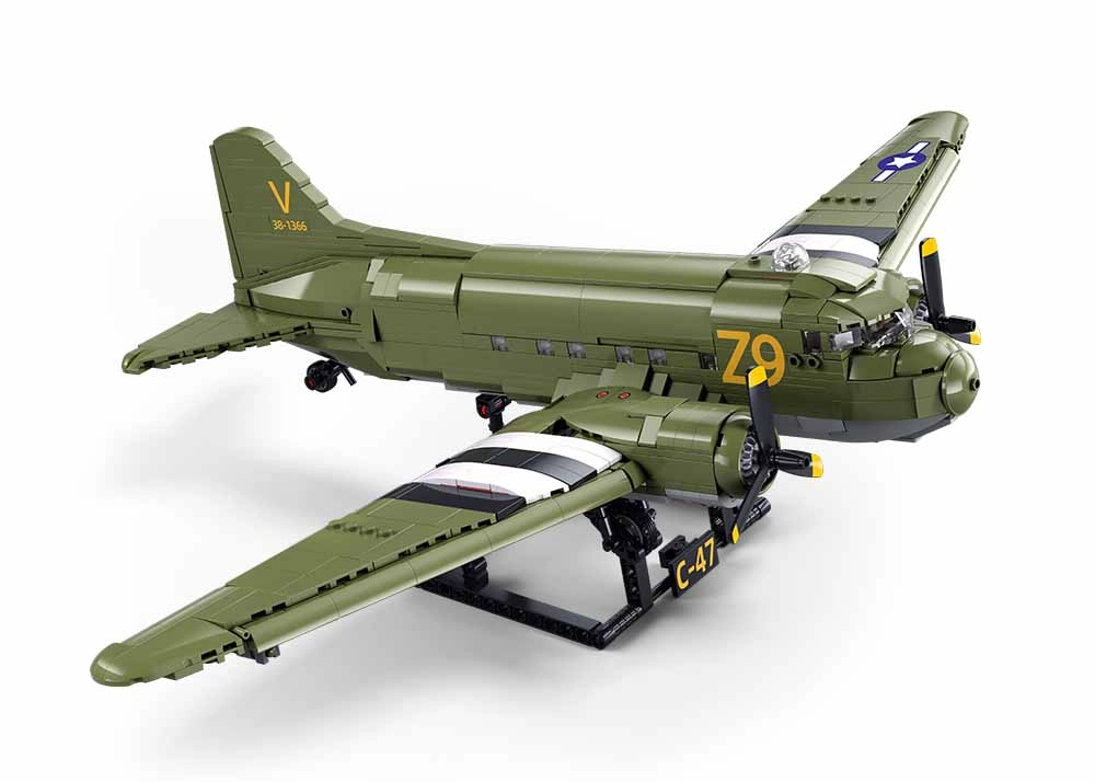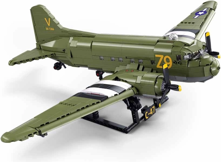 Ez a részletgazdag készlet hűen adja vissza az ikonikus, kétmotoros szállító repülőgépet széles törzzsel, kidolgozott szárnyakkal és a katonai gépekre jellemző autentikus elemekkel. A nyitható pilótafülke és a hátsó rakodótér révén könnyedén megrendezheted a deszant műveleteket és a valósághű játékszcenáriókat. A forgó légcsavarok és a működő futómű dinamizmust és hatásos megjelenést adnak a polcon és játék közben is.