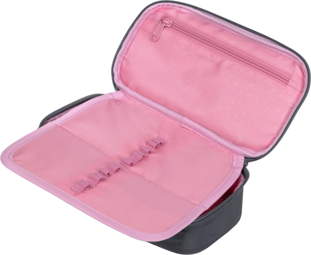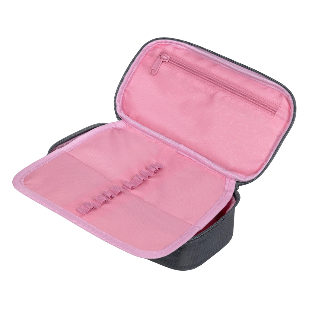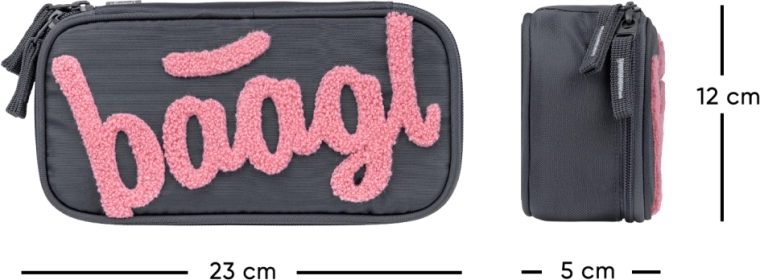 A praktikus BAAGL tolltartó elegáns sötétszürke színben, rózsaszín logóval ötvözi a modern megjelenést az okos tagolással. A fő rekesz elegendően tágas az írószereknek és apróságoknak, míg a dupla kihajtható fedőlap rugalmas pántokkal mindent átláthatóan a helyén tart. Belső zseb és átlátszó órarend-ablak is található benne, hogy az iskolai nap során gyorsan eligazodj.
