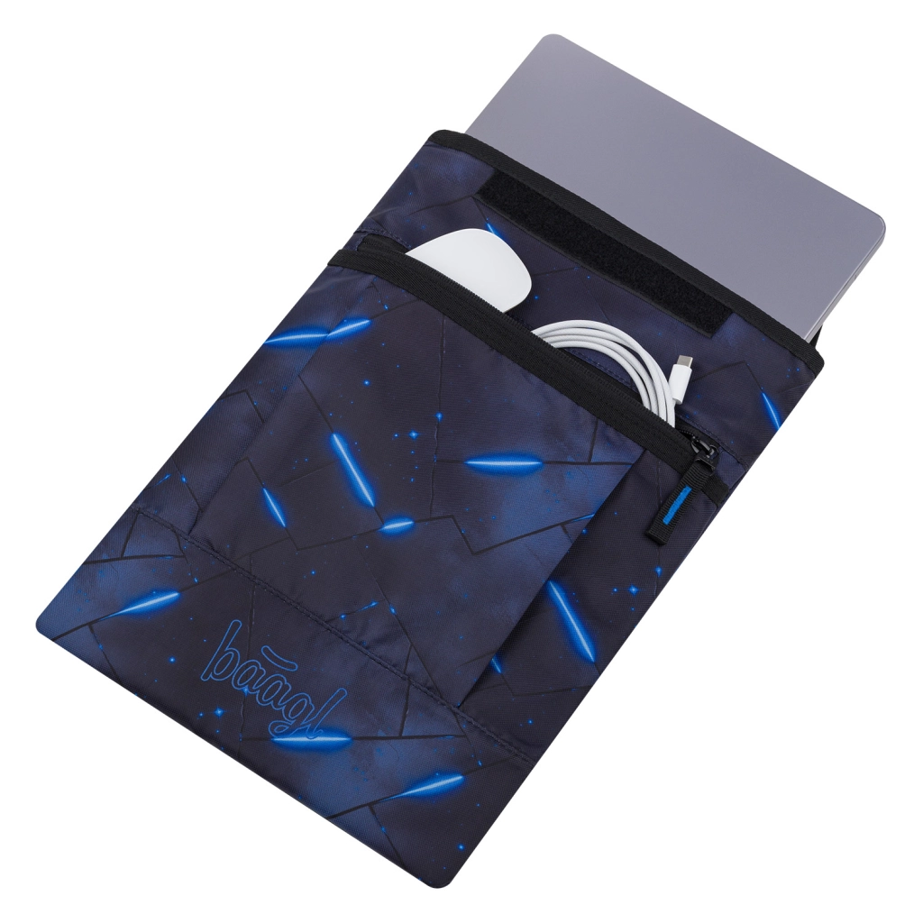 A számos minta közül választva könnyedén összehangolhatja a tokot más BAAGL felszerelésekkel. Az elülső zsebben elfér a töltő, egér vagy kábelek, így minden kéznél van. Az anyag megfelel a Global Recycled Standard (GRS) előírásainak, ami a környezetkímélő és felelős gyártást igazolja.