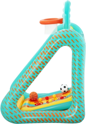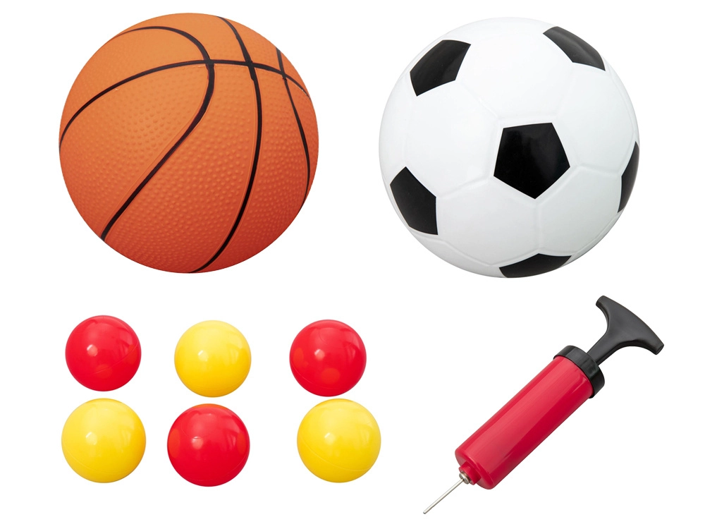 A szett része egy kézi pumpa és különféle labdák – mini kosárlabda, mini focilabda és kis dobólabdák. Csak felfújni és már mehet is a játék.