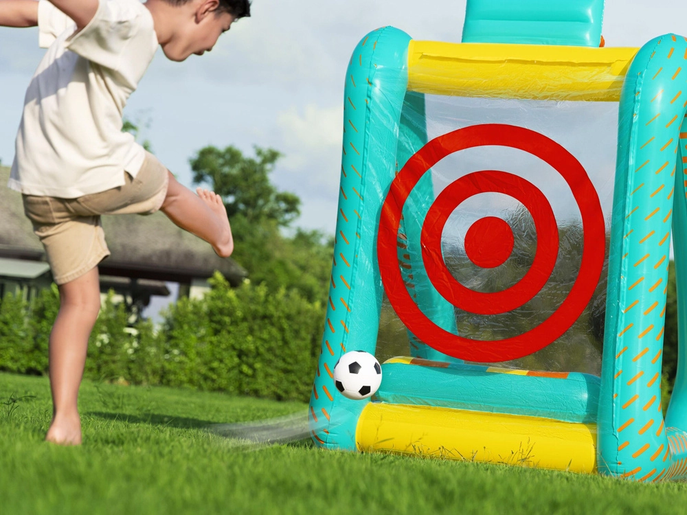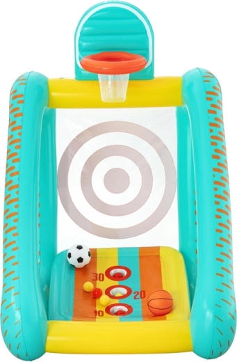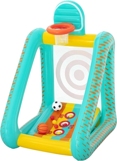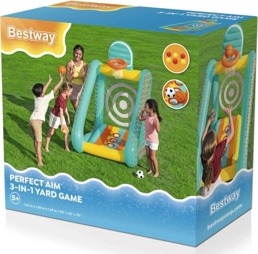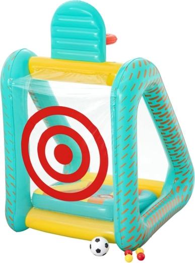 A Bestway Perfect Aim 3 az 1-ben felfújható multifunkciós szett játszóteremmé varázsolja az udvart, a kertet vagy a tágas nappalit. A nagyvonalú méretek lehetővé teszik, hogy egyszerre több gyerek is játsszon, a PVC-ből készült puha falak pedig növelik a biztonságot minden pattanhatásnál.