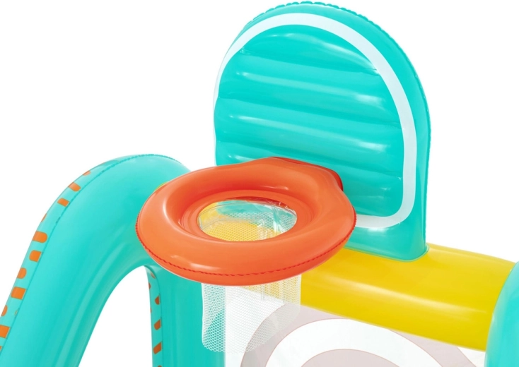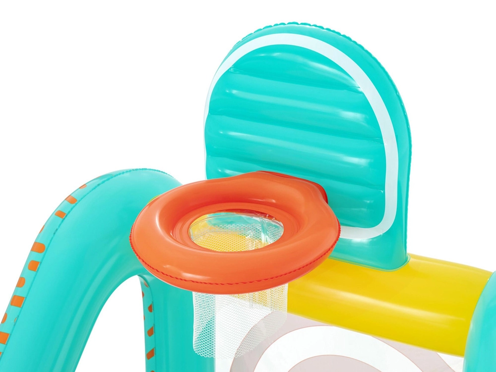 Tartalmaz kosárgyűrűs palánkot a pontos dobásokhoz, átlátszó, pontozott céltáblát, valamint dőltsíkú rámpát pontozott nyílásokkal a koordináció és a pontosság gyakorlásához. A vízzel tölthető talapzat szilárdan a helyén tartja a szerkezetet, így a szórakozás stabil marad élénk játék közben is.