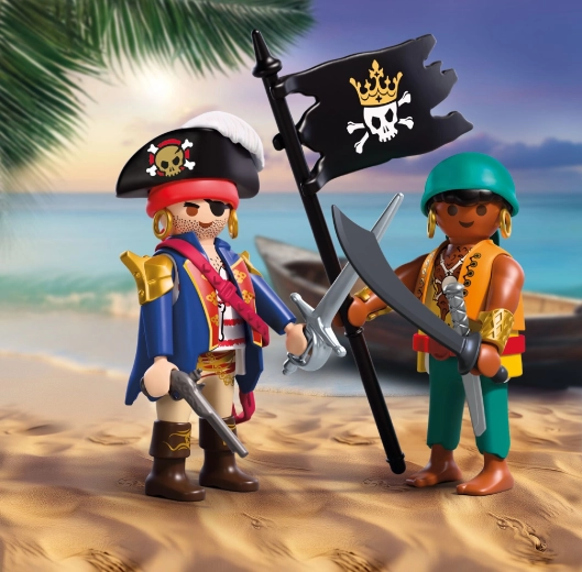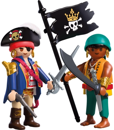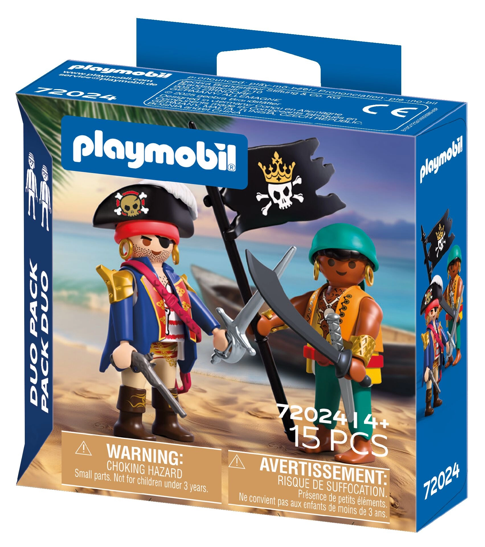Ez a kompakt Duo Pack szett két kalóz figurát (kb. 7,5 cm) kínál, készen a merész küldetésekre. A felszerelésnek köszönhetően, mint például a kalap, szablya, pisztoly vagy a kalózzászló, könnyedén megalkothatók izgalmas csatajelenetek és feszültséggel teli kincskeresések.