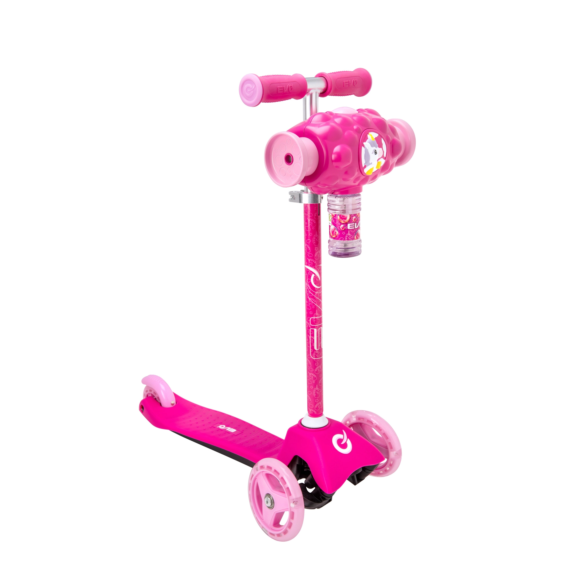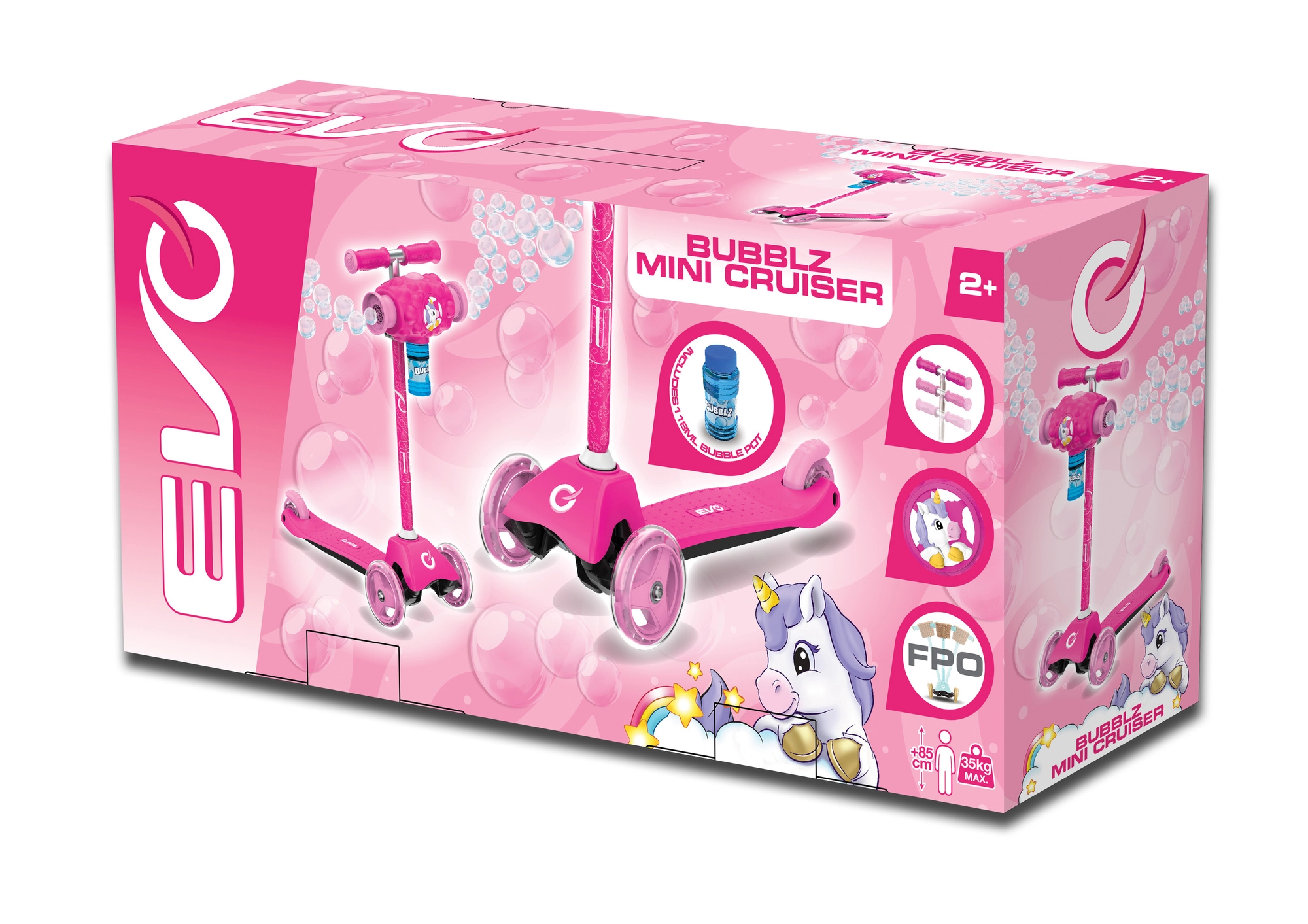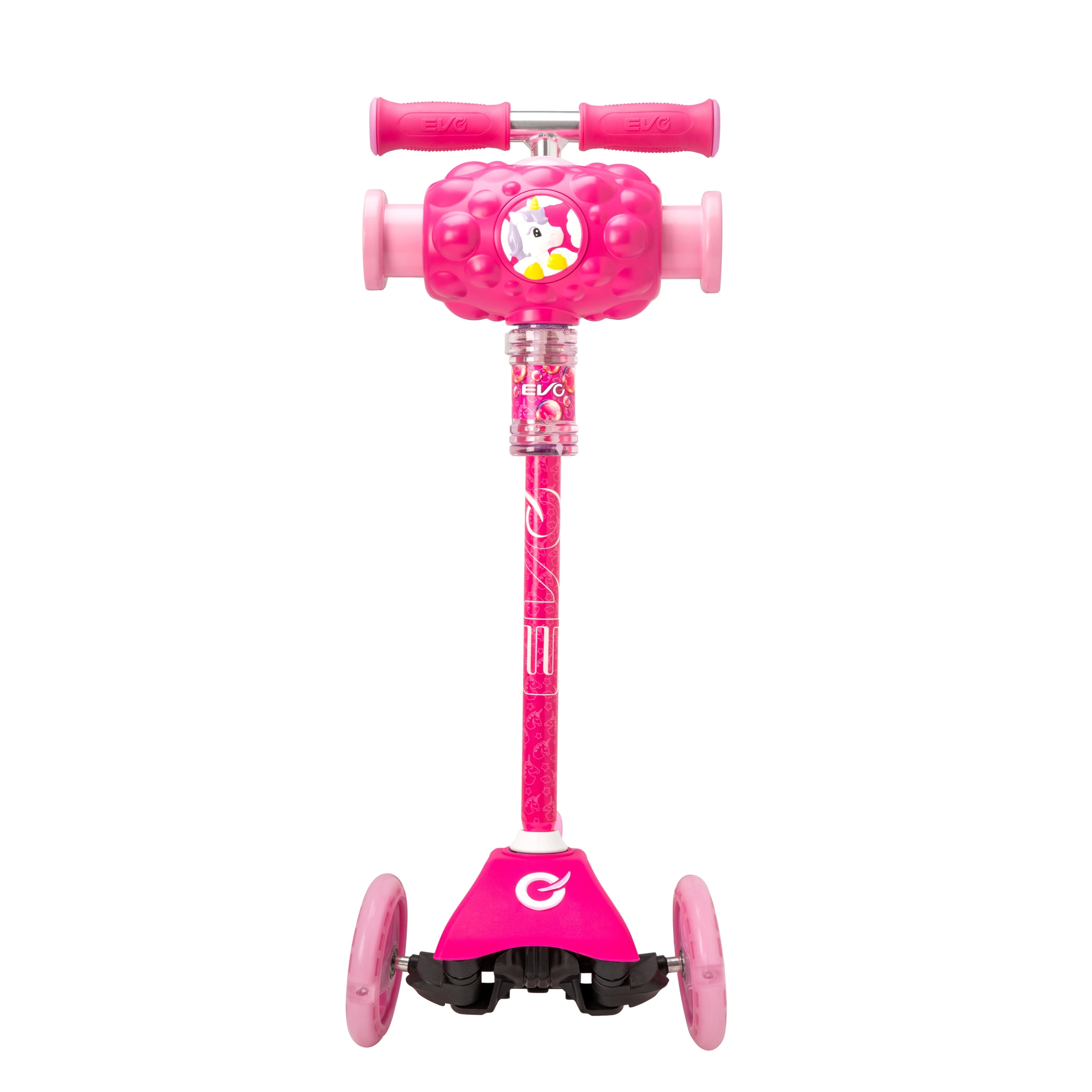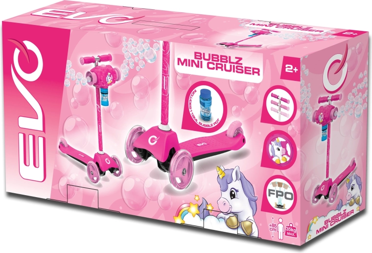 Az EVO Bubblz Mini Cruiser játékos és biztonságos háromkerekű roller a legkisebbeknek. A két első és egy hátsó keréknek köszönhetően kiváló stabilitást kínál, a dőlésvezérelt irányítás pedig segít a gyerekeknek természetes módon gyakorolni az egyensúlyt és a koordinációt. Az állítható kormánymagasság a gyermek testalkatához igazítható, így a roller együtt nő vele.