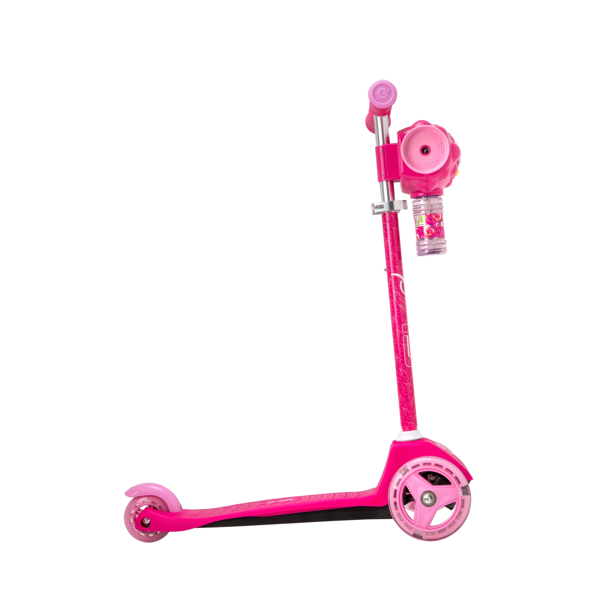 Az igazi attrakció az integrált buborékkészítő, amely menet közben buborékokat fúj, és minden utat vidám szórakozássá varázsol. A csúszásmentes fellépőfelület, a puha TPR markolatok és a hátsó lábfék növelik a biztonságérzetet és a kezelési kényelmet.