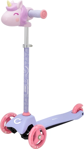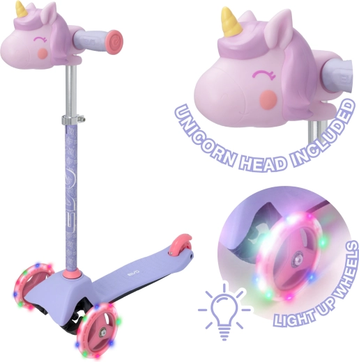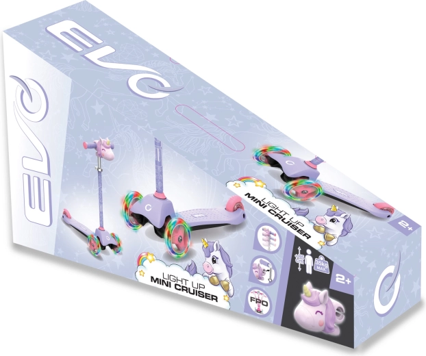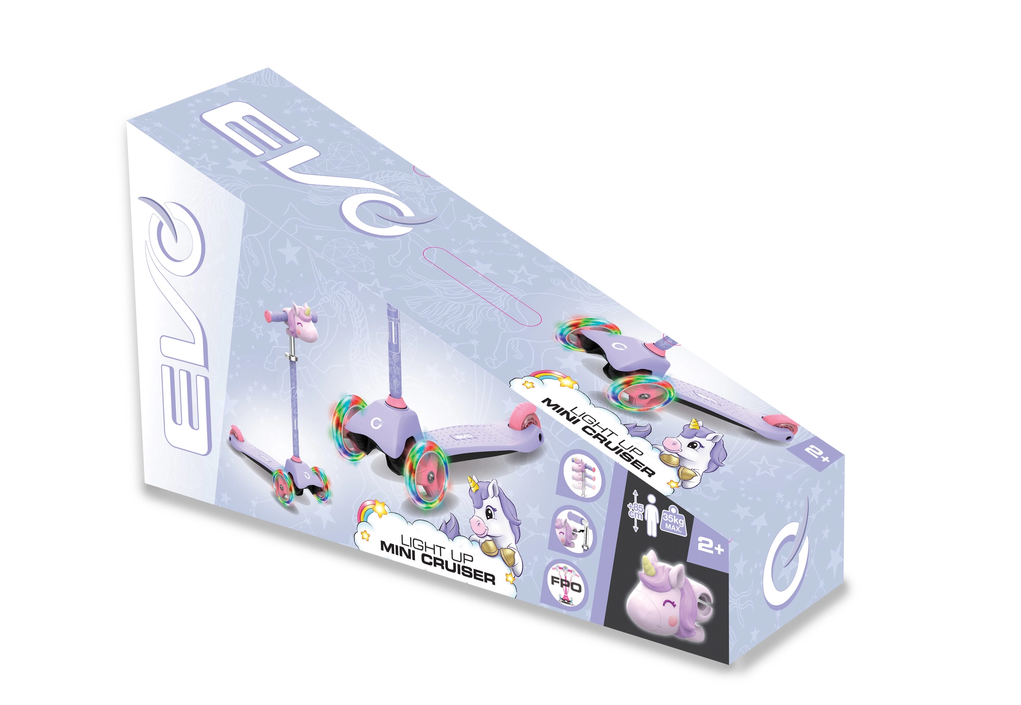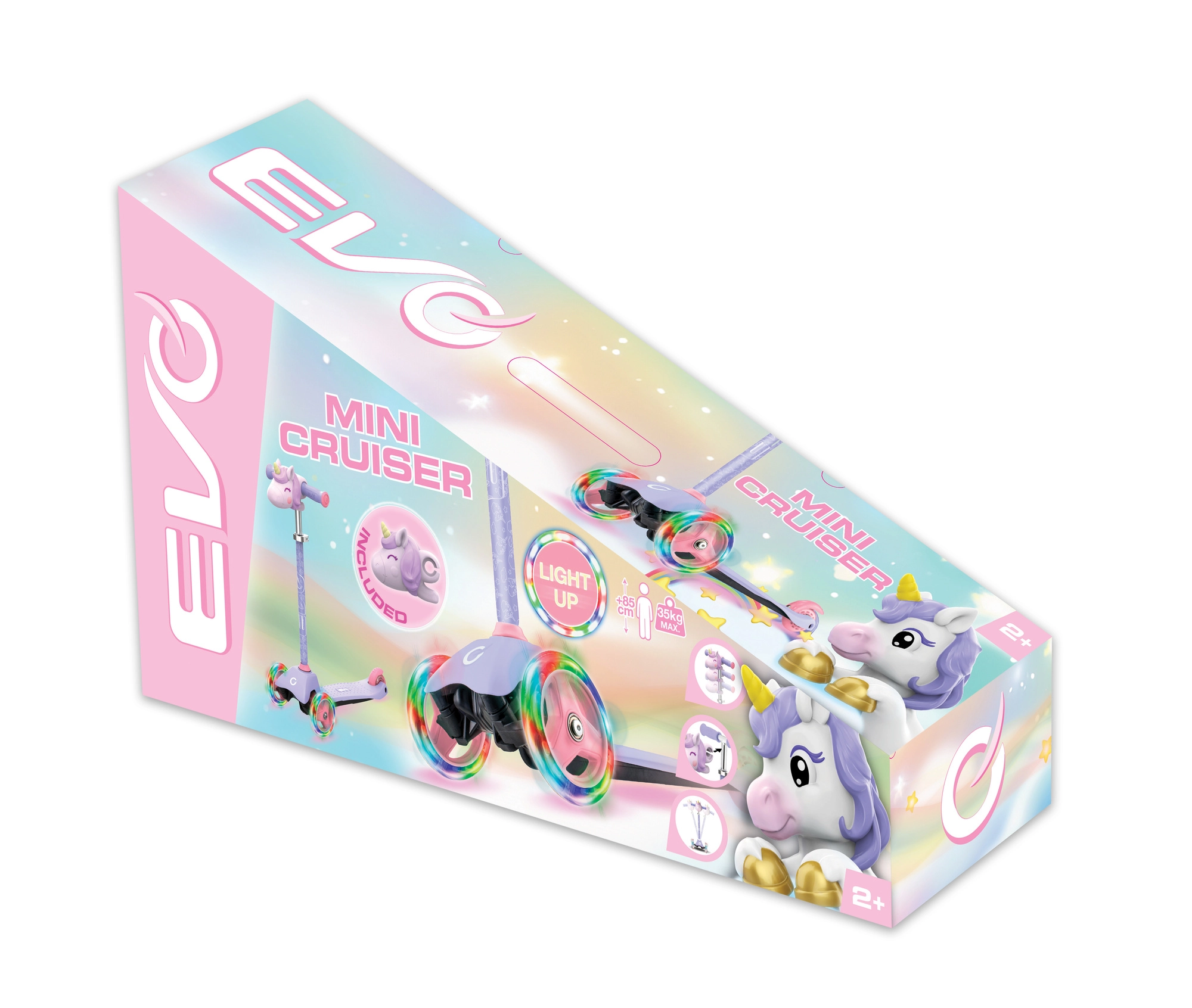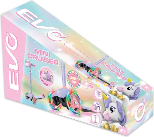 A EVO Light Up Mini Cruiser gyerek háromkerekű roller unikornis mintával már 2 éves kortól örömet szerez a kicsiknek. Stabil három kerék, széles, alacsony fellépő, állítható kormány és világító első kerekek gondoskodnak a még szórakoztatóbb utazásról. A dőléssel irányított kormányzás fejleszti a egyensúlyt és a koordinációt, míg a hátsó lábfék biztonságos megállást biztosít.