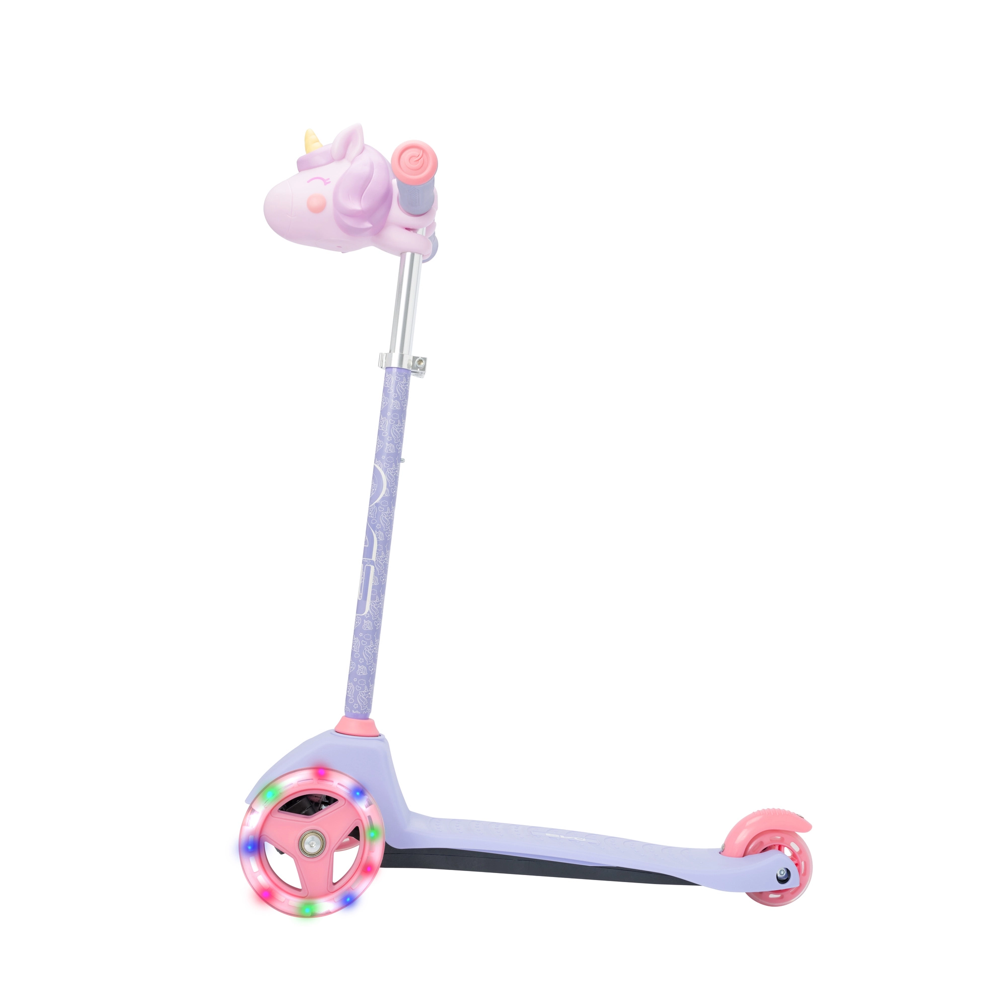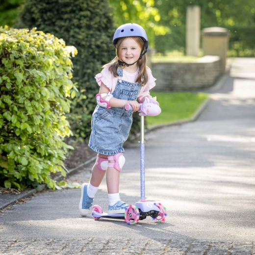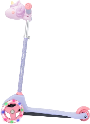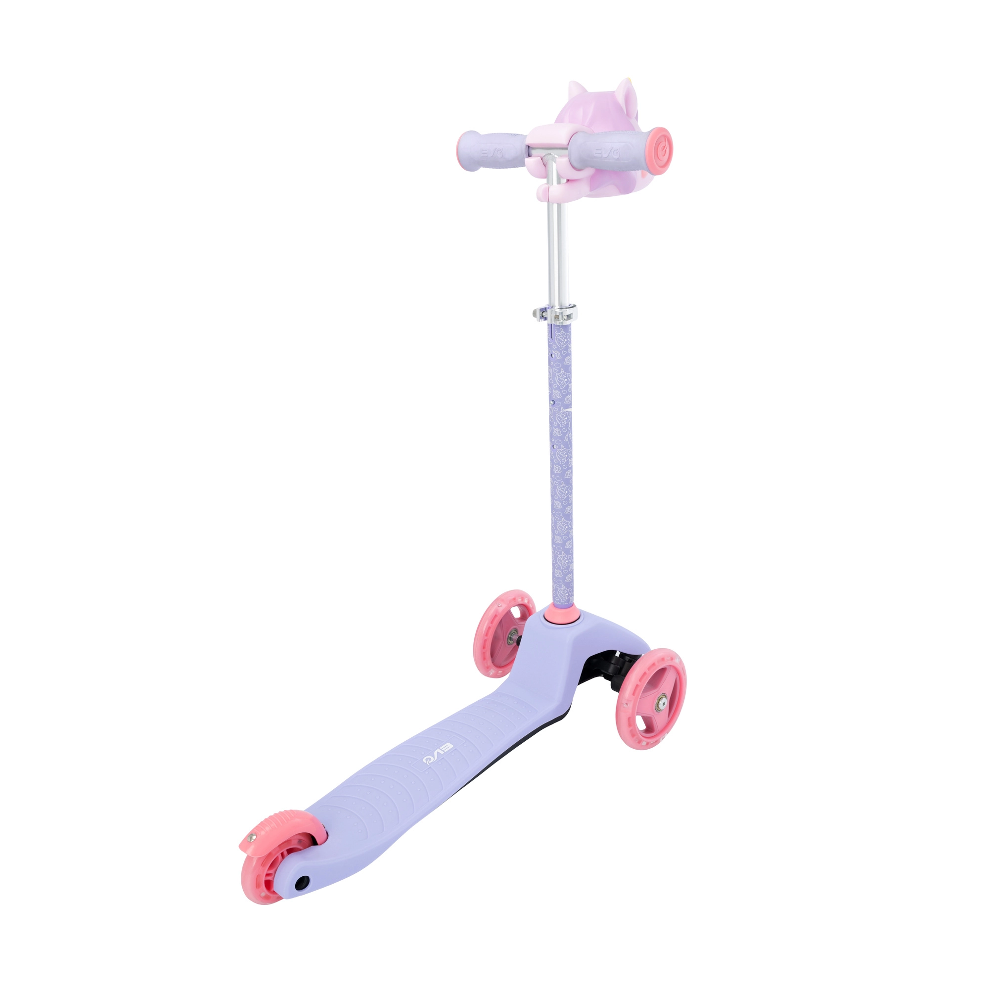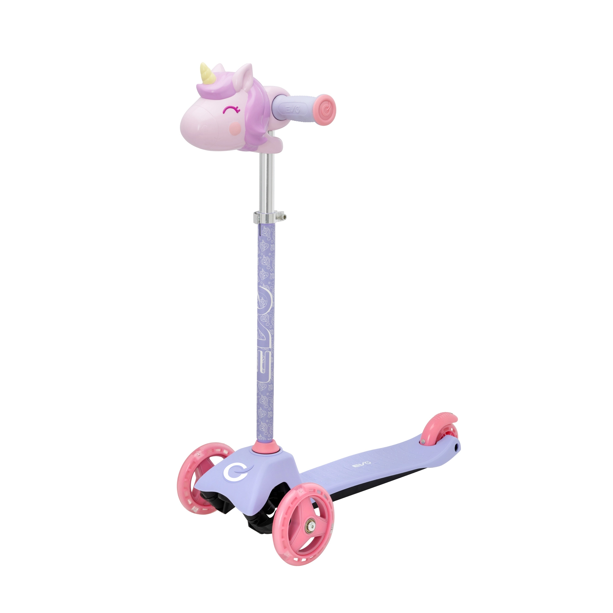 A EVO Light Up Mini Cruiser gyerek háromkerekű roller unikornis mintával már 2 éves kortól örömet szerez a kicsiknek. Stabil három kerék, széles, alacsony fellépő, állítható kormány és világító első kerekek gondoskodnak a még szórakoztatóbb utazásról. A dőléssel irányított kormányzás fejleszti a egyensúlyt és a koordinációt, míg a hátsó lábfék biztonságos megállást biztosít.