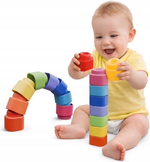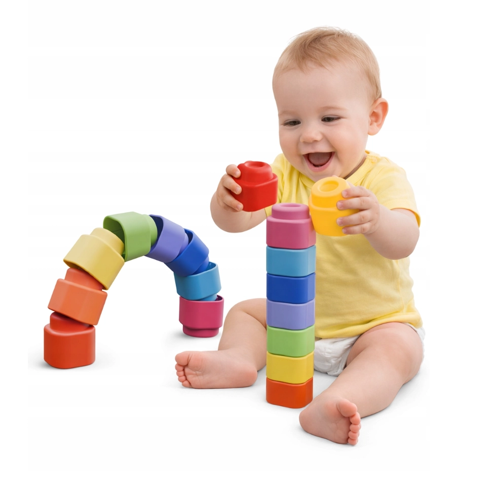 A puha és színes Soft Clemmy kockák ideális választás az első építős játékhoz. Kellemes, rugalmas anyagból készültek, amely bababarát – biztonságos érintésre és rágcsáláskor is. Az intenzív színek serkentik a látást, a kíváncsiságot és a kreativitást, miközben az egymásra rakás és összekapcsolás fejleszti a kéz–szem koordinációt és a finommotorikát.