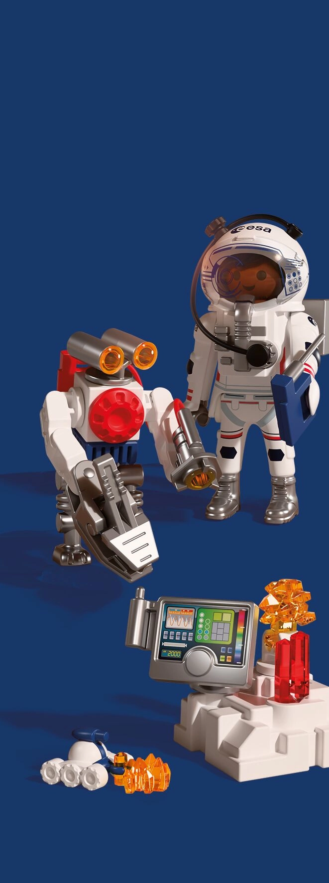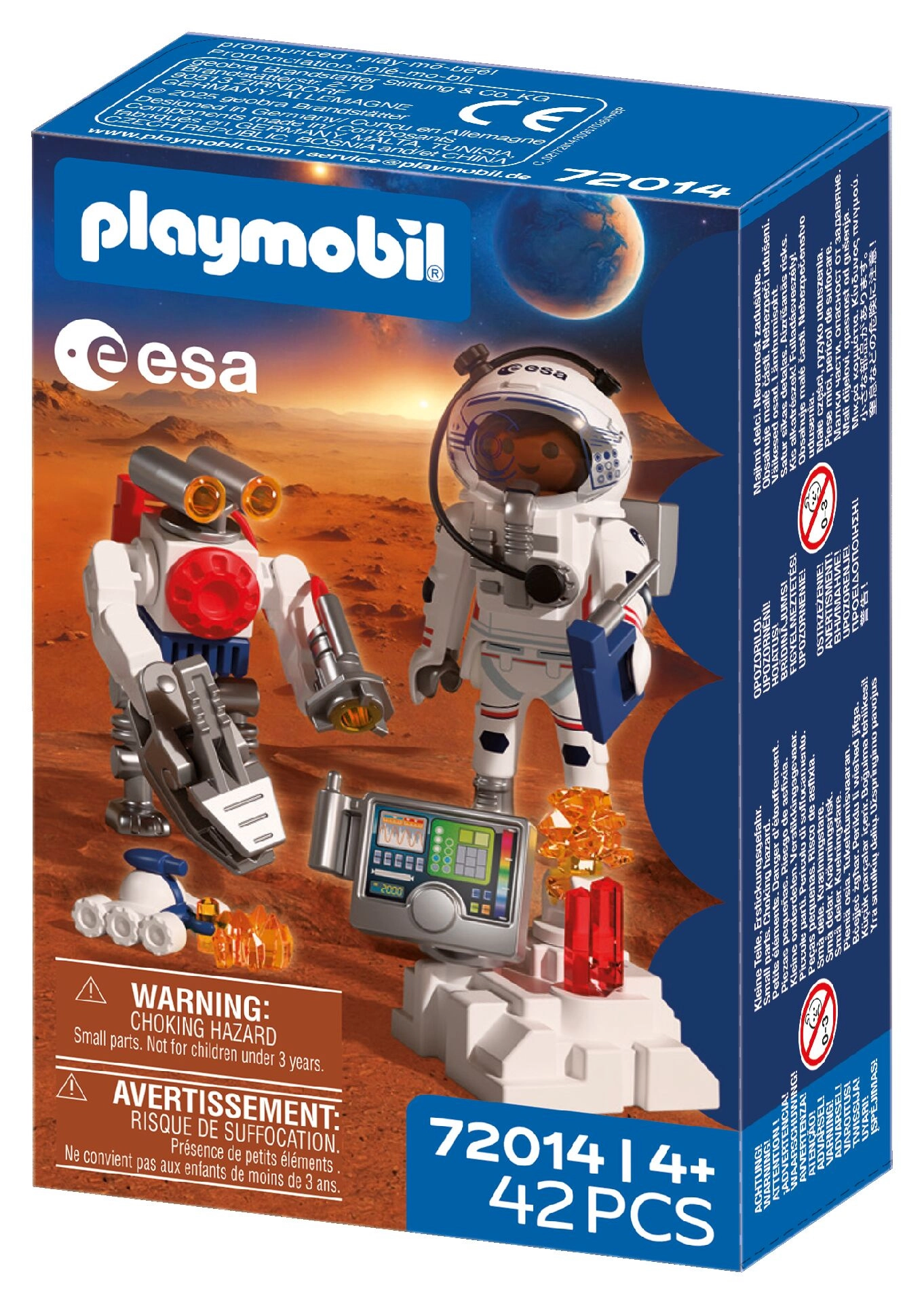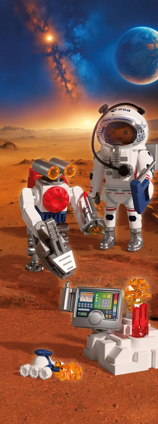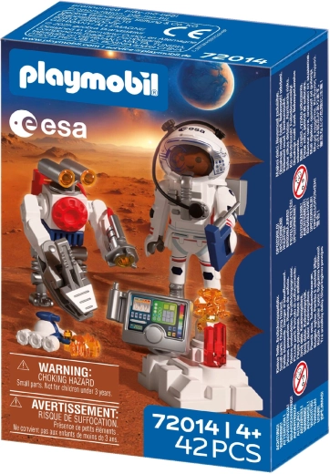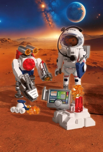 Élj át hiteles űrkalandot a PLAYMOBIL és az ESA együttműködésének köszönhetően. Az űrhajós az ügyes robottal és a sokoldalú járművel a vörös bolygó felszínét kutatja, talajmintákat gyűjt és titokzatos jeleket derít fel a Mars mélyéről. A robot mozgatható, fogókarja megkönnyíti a leletek felemelését, míg a skorpióra emlékeztető jármű a nehezen megközelíthető helyekre is eljut.