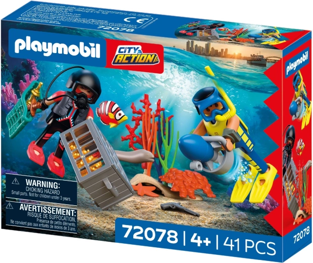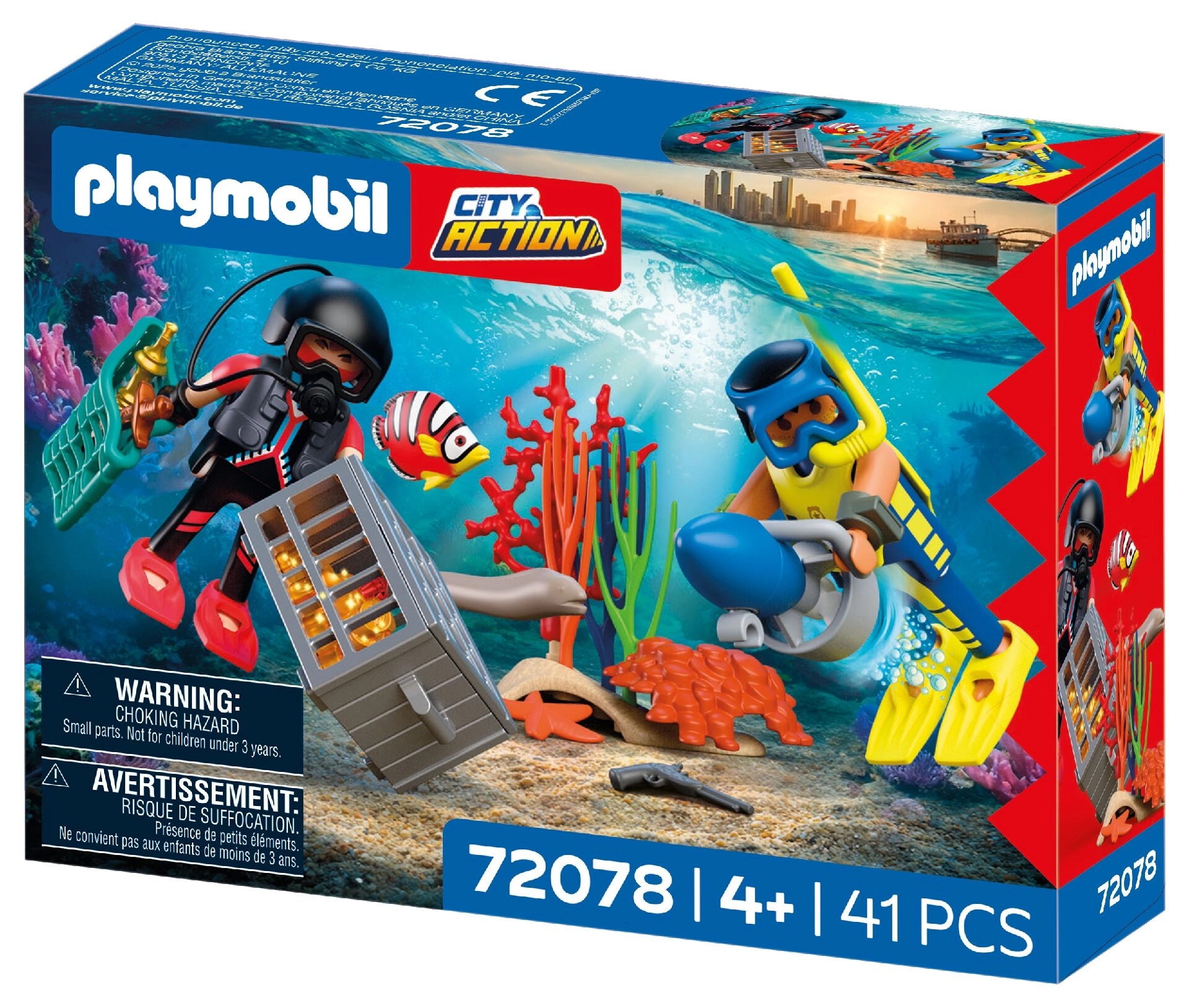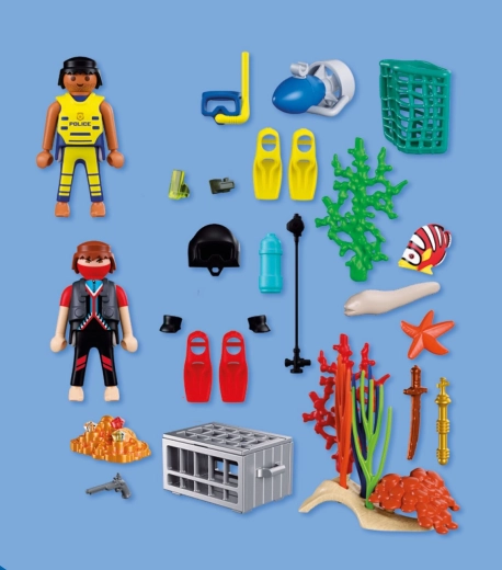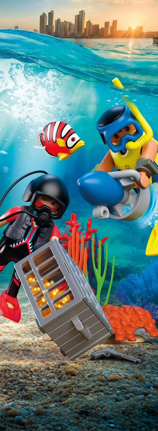 A készlet akciódús üldözést kínál a tenger mélyén: az éber rendőrségi búvár követi a tolvajt, aki megpróbálja elrejteni a kincses ládikót a hínár és a korallok között. A víz alatti robogónak, a felszerelésnek és a valósághű kiegészítőknek köszönhetően a gyerekeket számos izgalmas küldetés és szabad felfedezés várja a víz alatti világban.