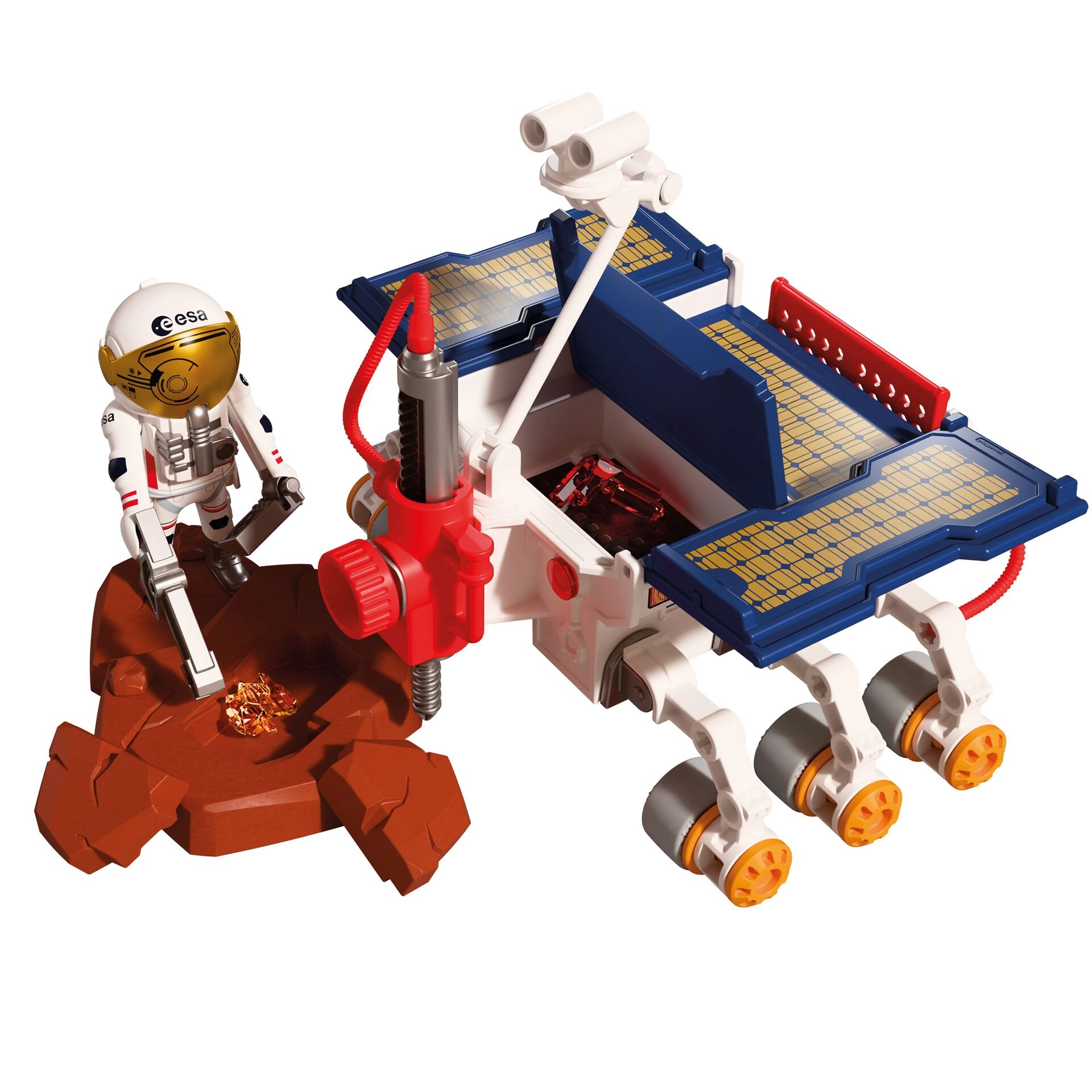 A csomag része egy űrhajós figura sisakkal és felszereléssel, működő elemek a mintagyűjtéshez, valamint tárolóhely a szerszámoknak. A masszív futóműnek köszönhetően a rover könnyedén mozog a „sziklás” felszínen, és órákig tartó, értelmes szórakozást nyújt a 4 évesnél idősebb kis felfedezőknek.