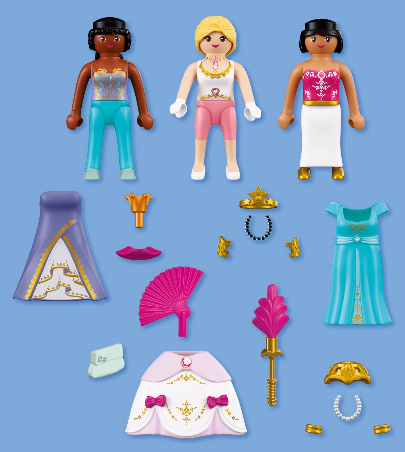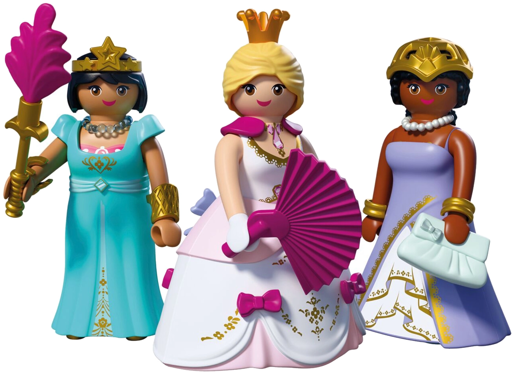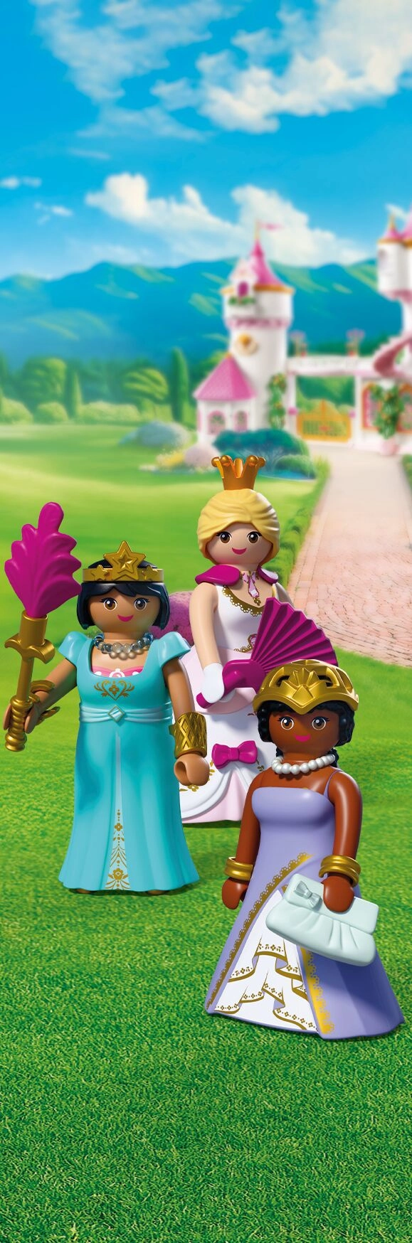 Három elbűvölő hercegnő hívja a gyerekeket királyi kalandokra. A cserélhető ruháknak, szoknyáknak és ékszereknek köszönhetően a kicsik könnyedén változtathatják a figurák megjelenését, és újra meg újra kitalálhatnak történeteket – a fényűző báltól a kastélykerti sétákig.