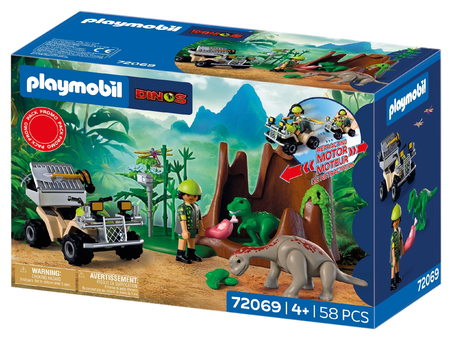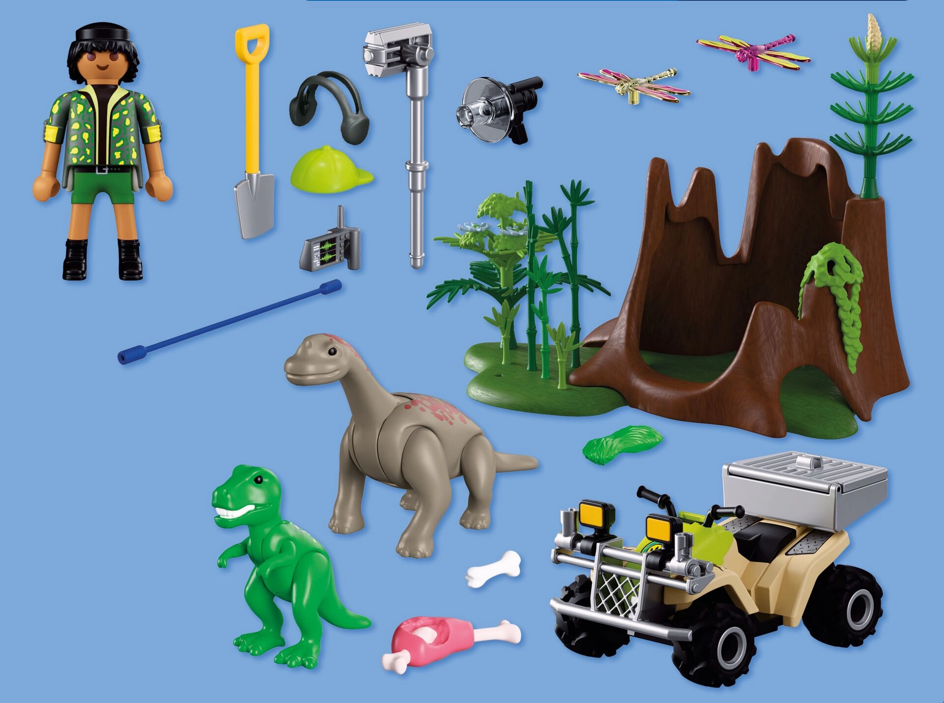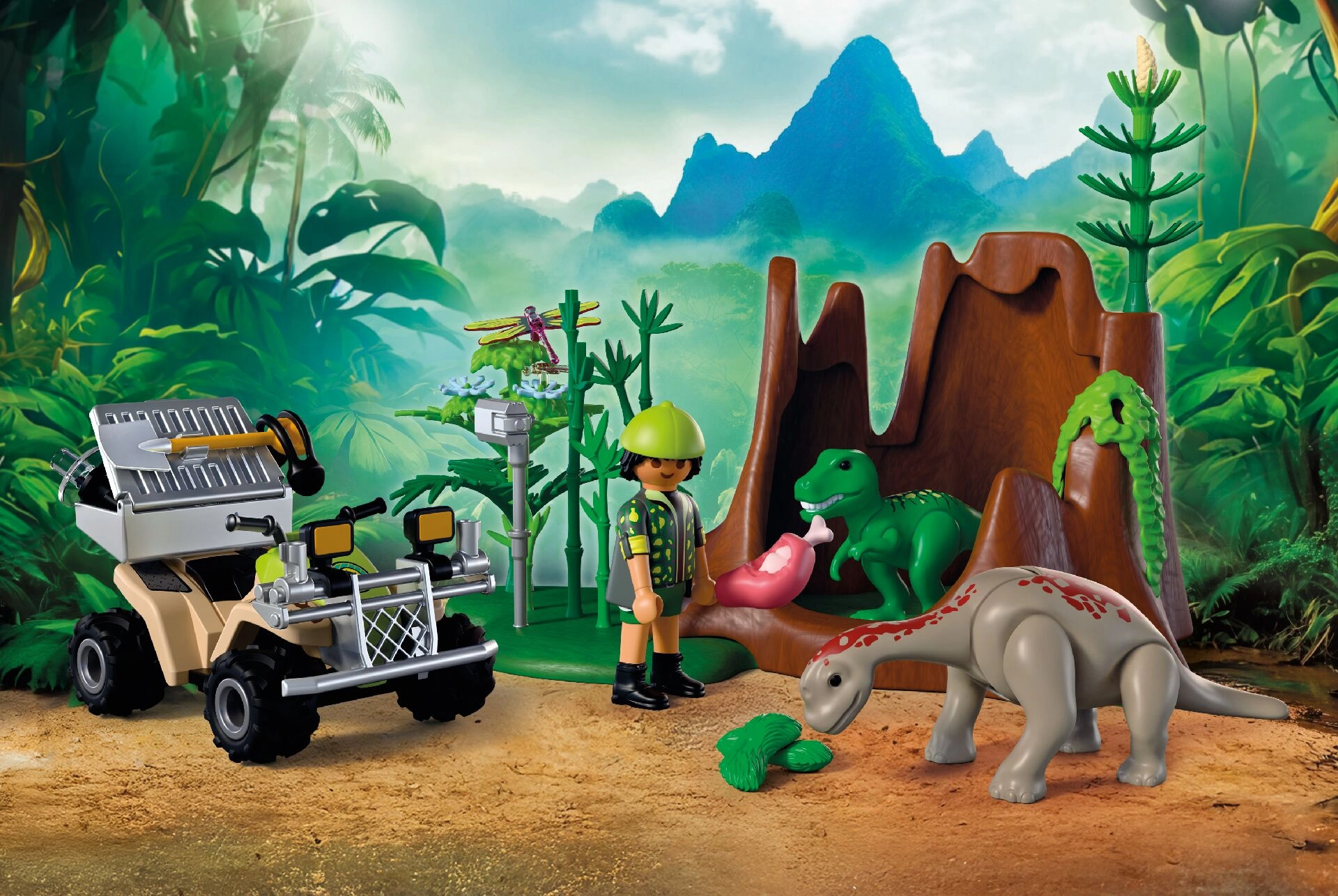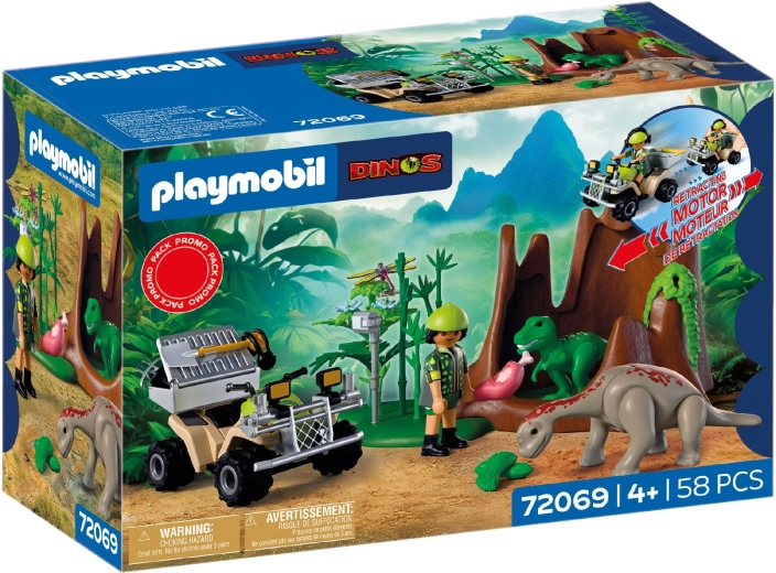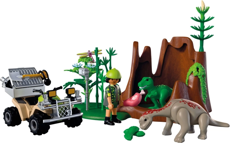Indulj izgalmas expedícióra a dinoszauruszok világába! A kutató a masszív quad visszahúzós (pull-back) meghajtásával átszeli a buja növényzetet, ahol rejtőzködő T‑Rex és Brachiosaurus kölyköket fedez fel. Felszerelésével hangokat rögzít, megfigyeli a viselkedésüket, és megfelelő táplálékkal eteti őket. A levehető szállítóládának és a szerszámok számára kialakított tárolóhelynek köszönhetően minden kirándulás egyszerű és átlátható.