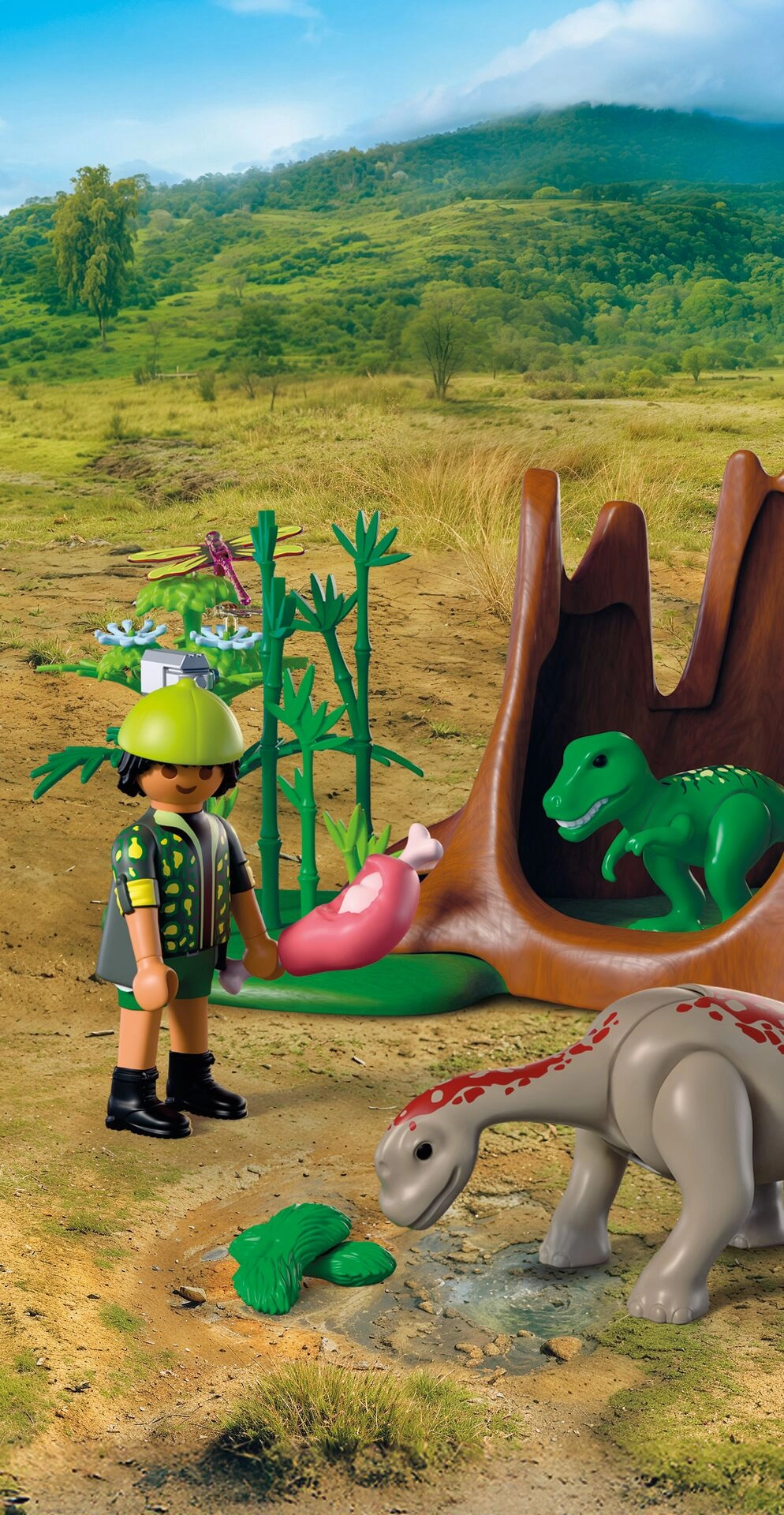 A környezet valósághű részletei – tuskó, bambuszok, virágok és növényzet – a dinoszaurusz figurákkal együtt magával ragadó, feszültséggel teli történetekbe vonják a gyerekeket. A szett kiváló a szerepjátékhoz, és más PLAYMOBIL készletekkel kombinálható, hogy még nagyobb, őskori kalandvilágot alkoss.