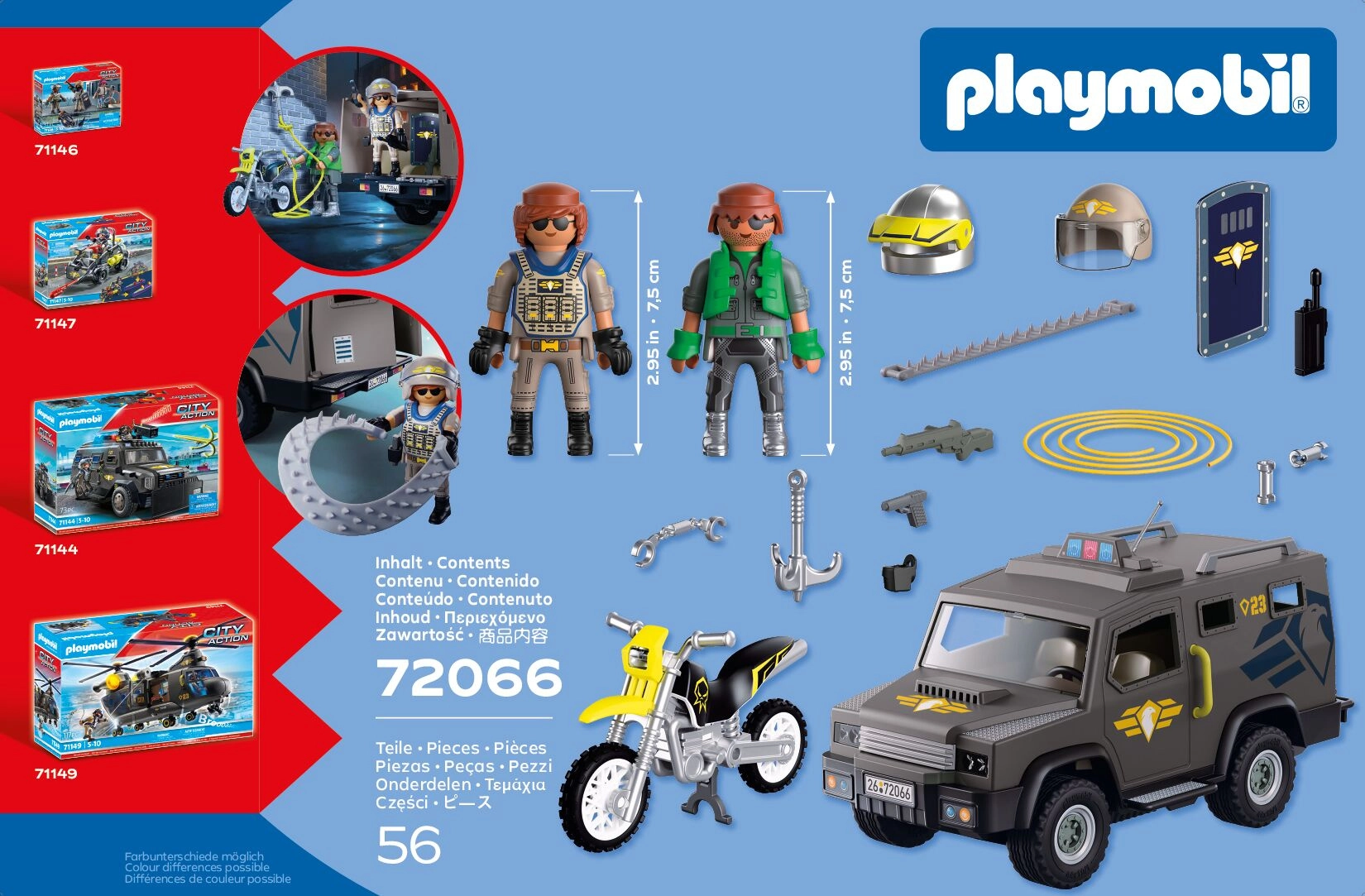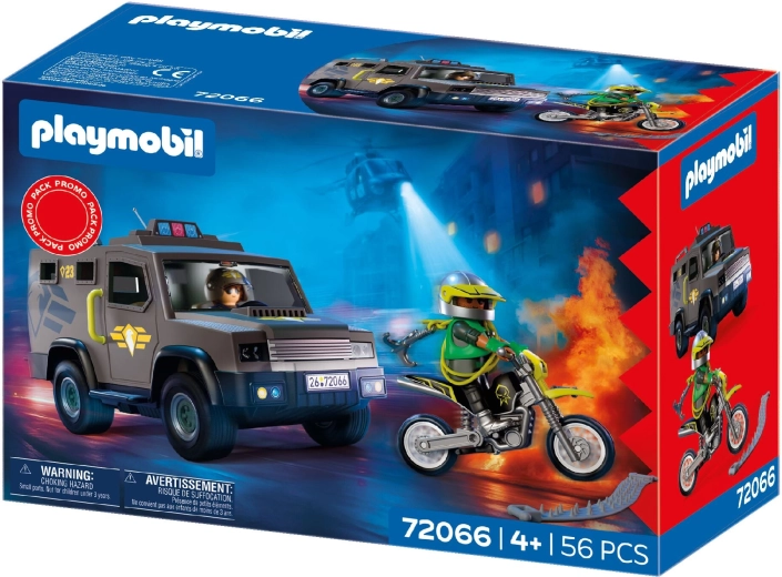 A csomagban 2 figura található – egy SWAT rendőr és egy bűnöző – valamint számos kiegészítő, például bilincs, pajzs, rádió és fegyverek, amelyekkel a gyerekek gyakorolhatják a taktikákat és fejleszthetik képzelőerejüket a szerepjáték során. A készlet kompatibilis más Playmobil építőkészletekkel, így tovább bővíti a játék lehetőségeit.