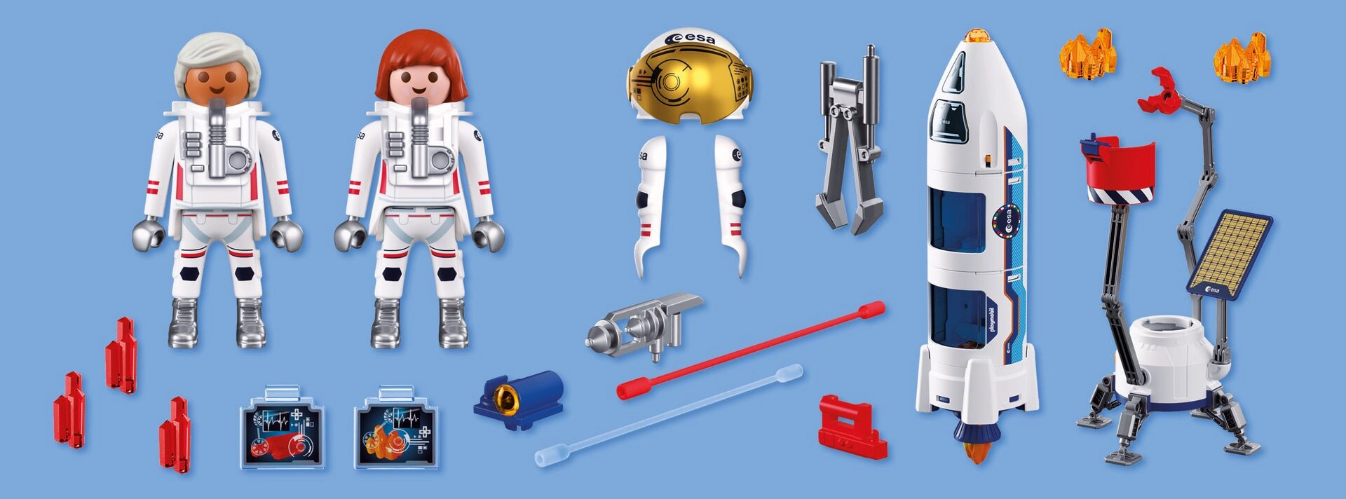 A szett tartalmaz 2 asztronauta figurát sisakokkal, speciális védőelemekkel és eszközökkel (beleértve a fúrót és a fogót), továbbá napelemes panelt, szervizkosarat, markolóval ellátott robotkart, indítóplatformot és marskőzet-mintákat. Tökéletes a PLAYMOBIL világ bővítéséhez vagy önálló készletként a 4 évesnél idősebb kis felfedezők számára.