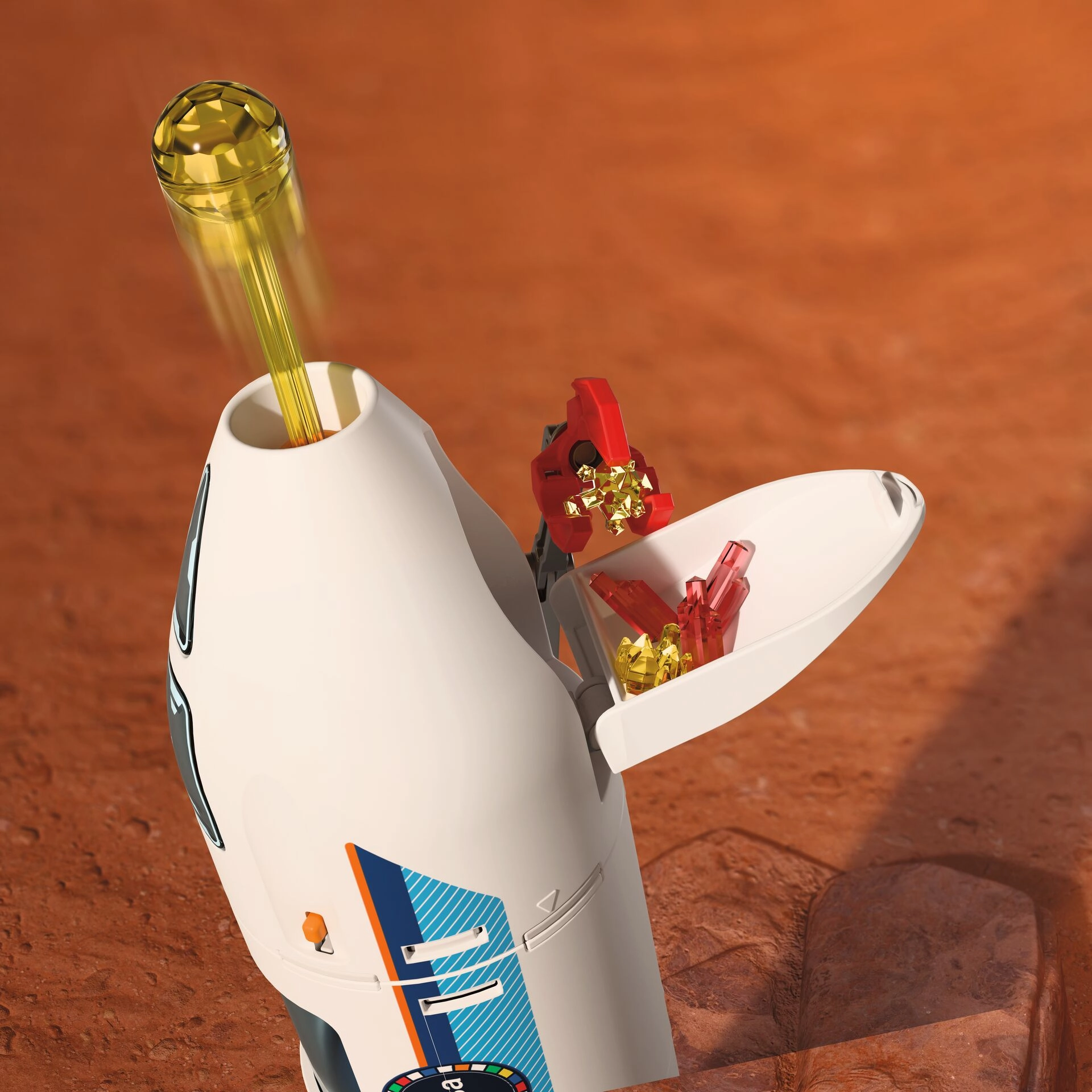 Ez a részletgazdag űrkészlet hiteles Mars-kutatási élményt nyújt. A moduláris felépítés lehetővé teszi a rakéta rövidítését és hosszabbítását, a dokkolást a mobil platformhoz, valamint a szervizkarok használatát karbantartáshoz vagy mintakezeléshez. Az átlátszó ablakoknak és a valósághű elemeknek köszönhetően a játék maximálisan magával ragadó.