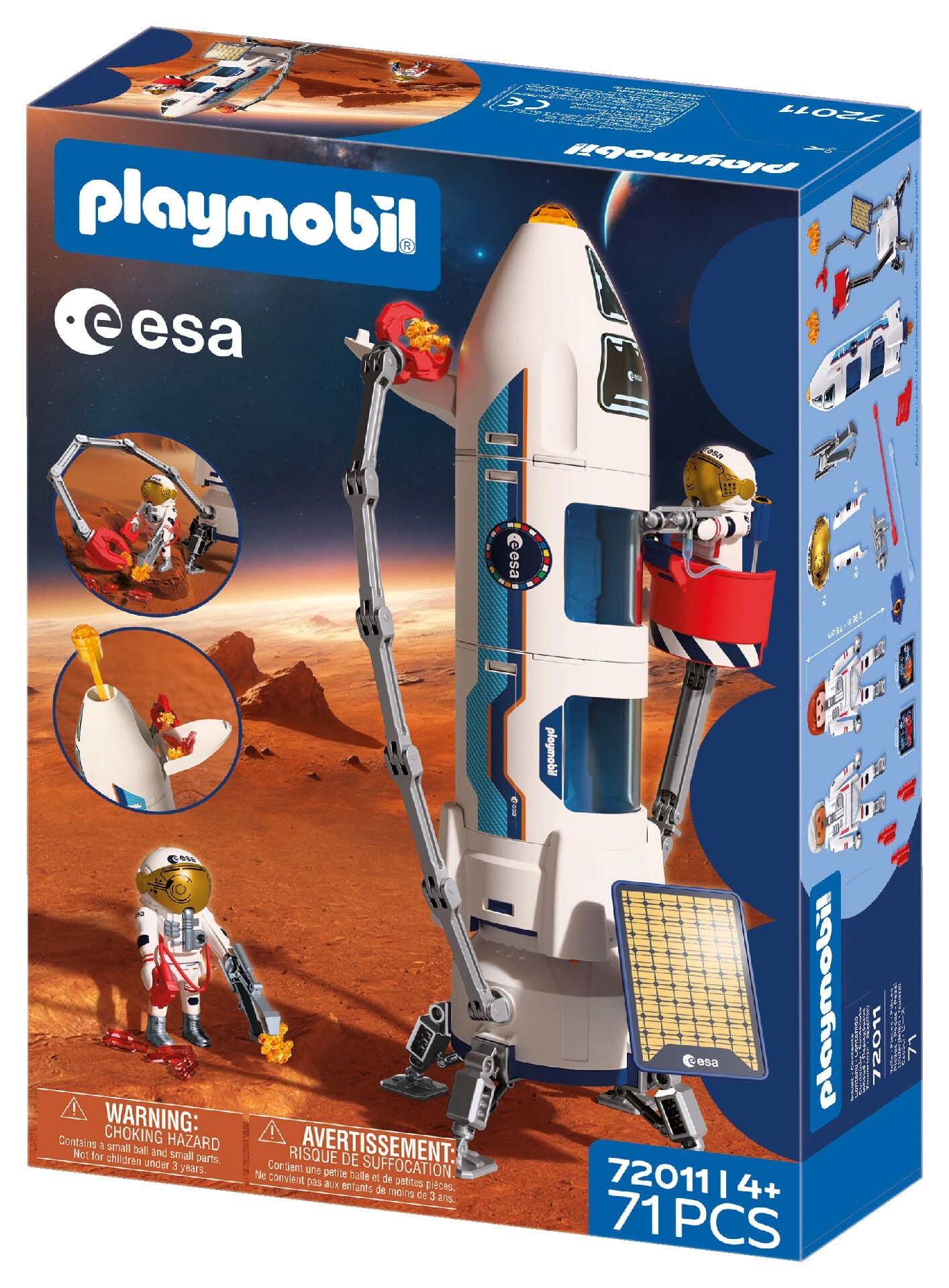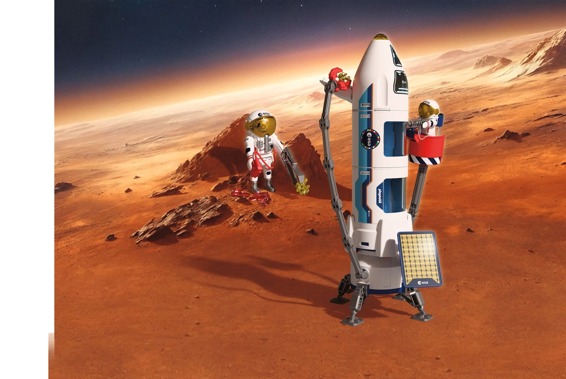 Indulj bolygóközi küldetésre az ikonikus PLAYMOBIL szettel, amely az ESA-val együttműködésben készült. A moduláris marsrakéta 2 asztronautával, mozgatható manipulátorral és gazdag tartozékkal támogatja a kreatív szerepjátékot és a fantázia fejlődését. Az elemek összekapcsolhatók és átalakíthatók, gyűjthetők kőzetminták, és szimulálható a leszállás, a szervizelés és a visszatérés a Földre.