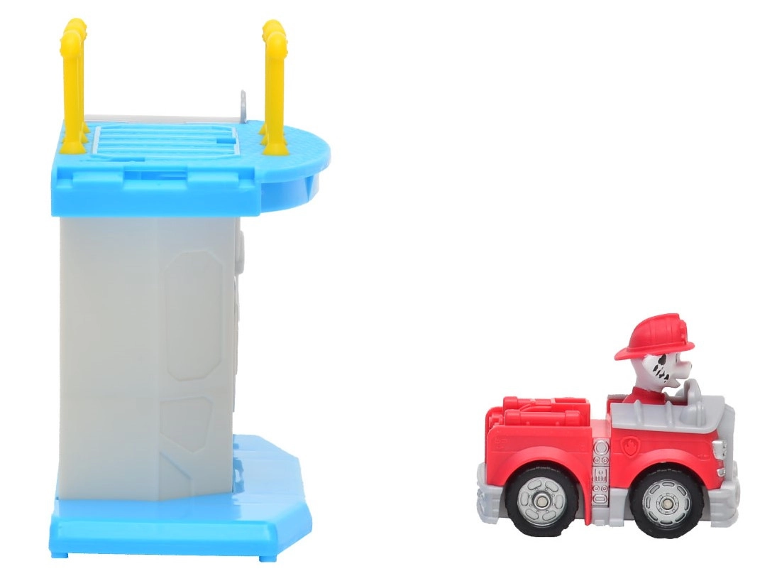 A szett része egy piros mini jármű beépített Marshall figurával – csak helyezd a platformra, és indulhat is az akció.