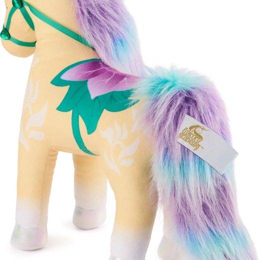 Fedezd fel a Unicorn Academy varázslatos világát ezzel a puha társával – a Leaf nevű plüss unikornissal, 38 cm-es méretben, a Spin Master márkától. Arany, csillogó szarva, opalizáló patái és dús sörénye és farka van türkiz és lila árnyalatokban. A finom, selymes plüss, a markáns lila szemek és a botanikus nyereg kantárral ideális játék társsá teszik bújáshoz, kreatív játékhoz és a gyerekszoba stílusos dekorálásához.