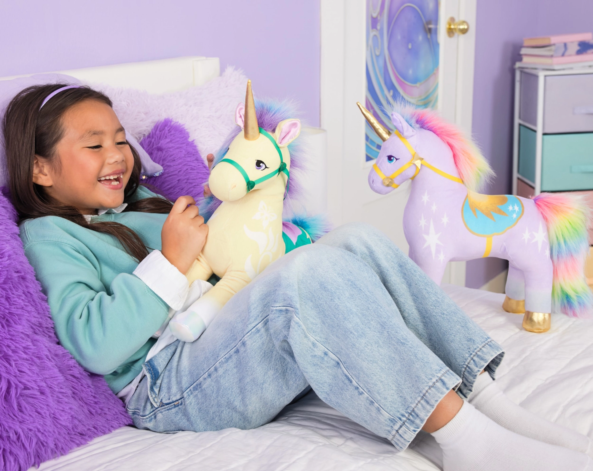 - Varázslatos részletek: arany szarv, gyöngyházfényű paták, élénk lila szemek, szatén fülbelsők.