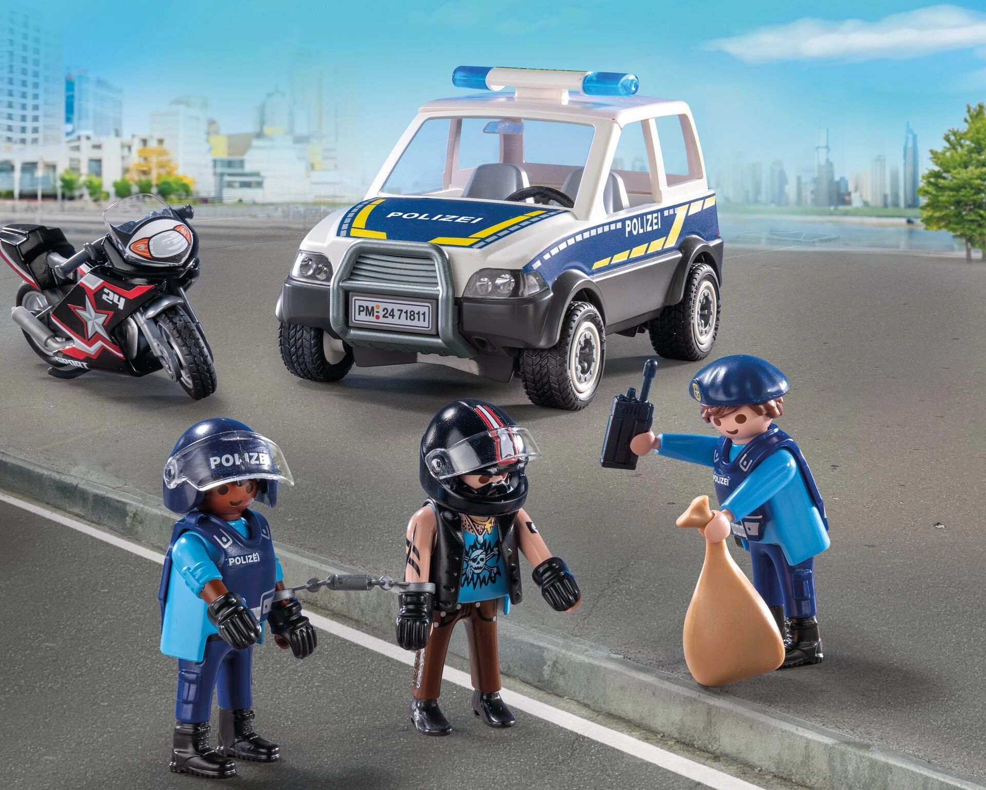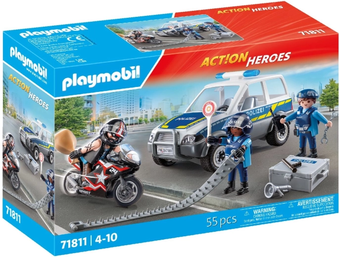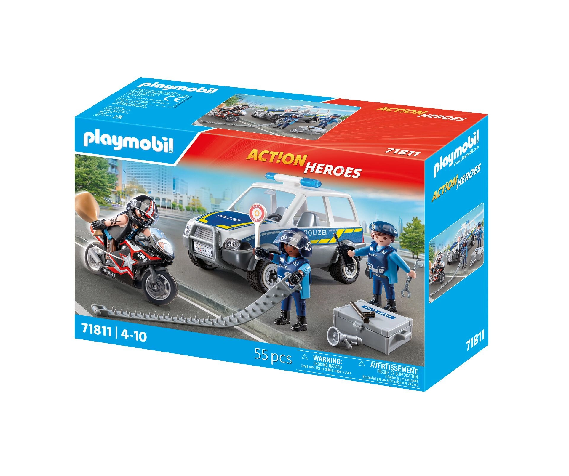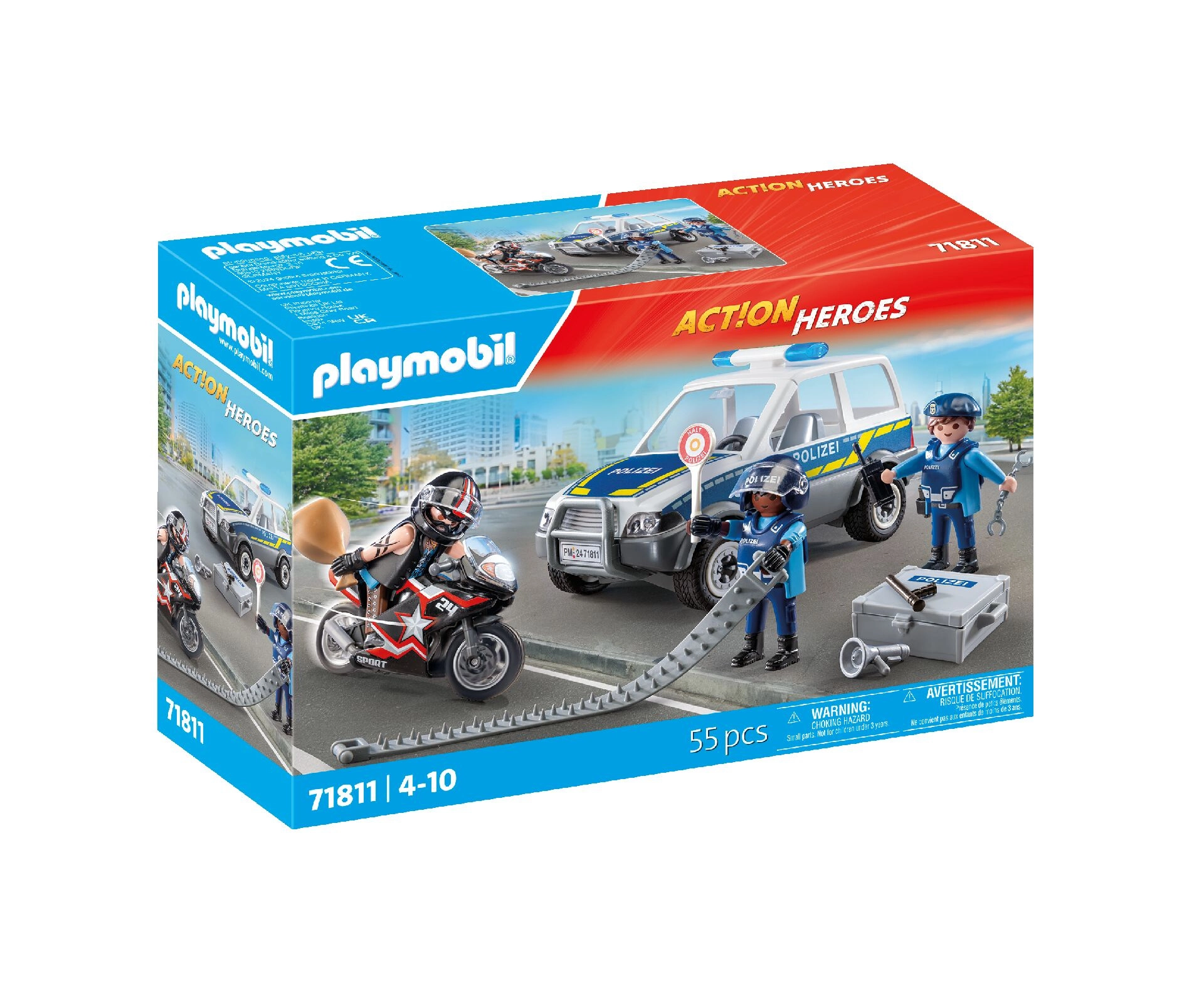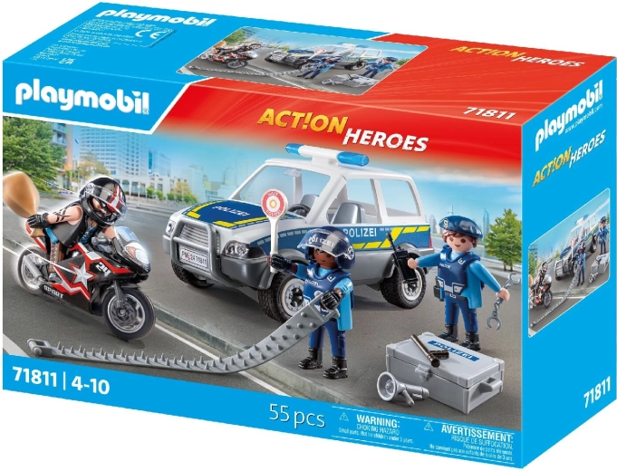 Keltse életre a gyerekek fantáziáját a dinamikus PLAYMOBIL City Heroes – Rendőrségi üldözés szettel. A bátor rendőr akcióba lendül, hogy elkapja a motoron menekülő tolvajt, miközben a bűnöző egy menő autóval próbál meglógni. A valósághű járművek, a precíz kidolgozás és a mozgatható figurák minden játék alkalmával magával ragadó élményt biztosítanak.