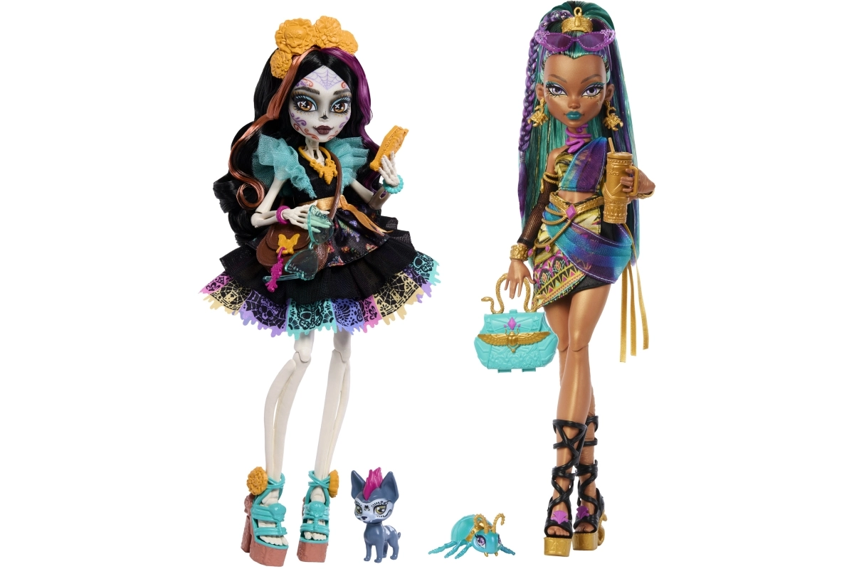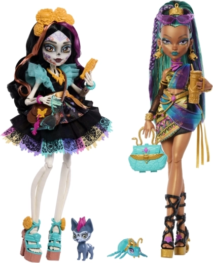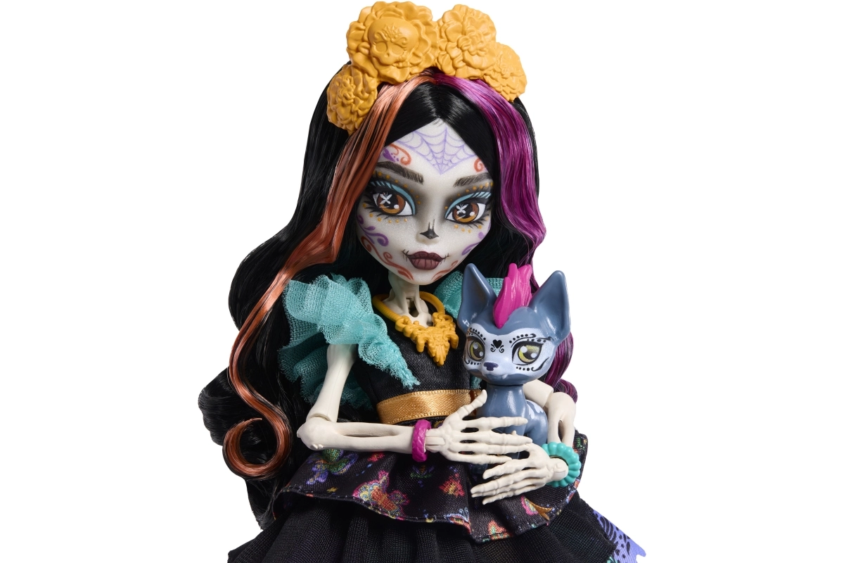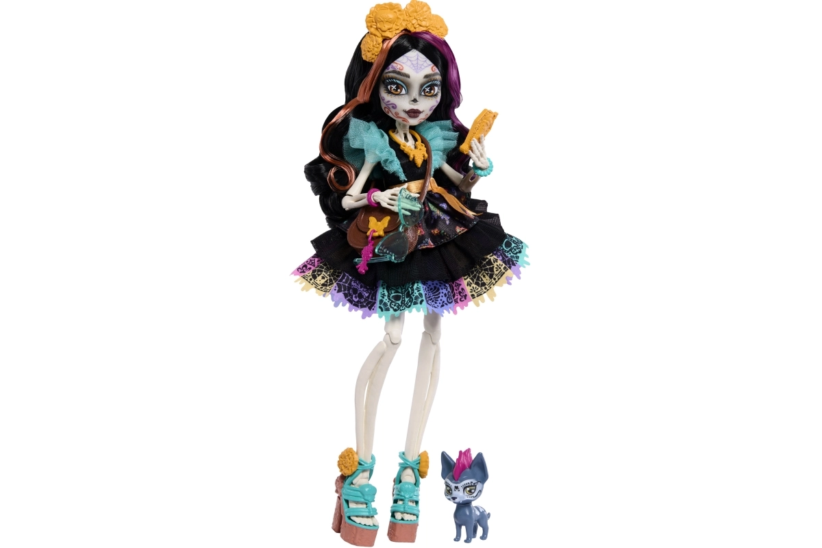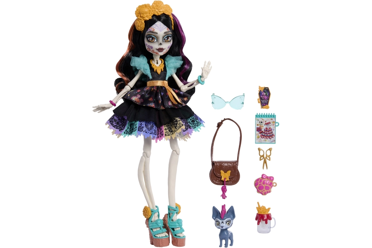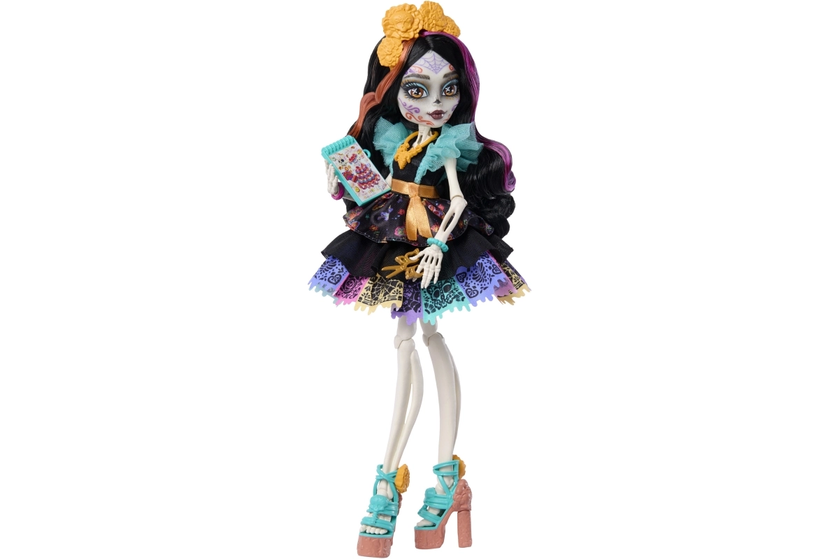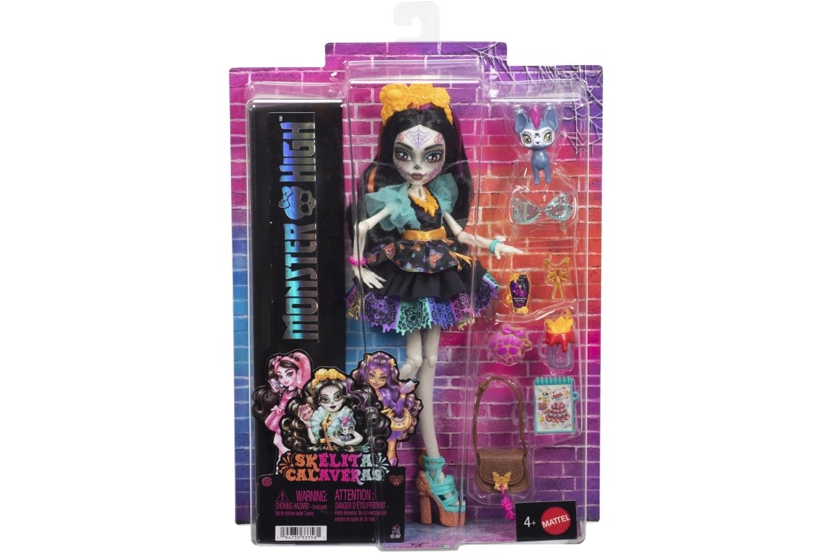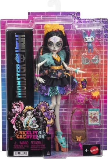 Skelita Calaveras egyedülálló, a Halottak Napja által ihletett megjelenést hoz a Monster High világába. Feltűnő sminkjének, részletgazdagon kidolgozott ruházatának és a sok színes kiegészítőnek köszönhetően a gyerekek órákon át élvezhetik a fantáziadús szórakozást. A mozgatható ízületek megkönnyítik a pózolást és a saját divatjelenetek megalkotását.
