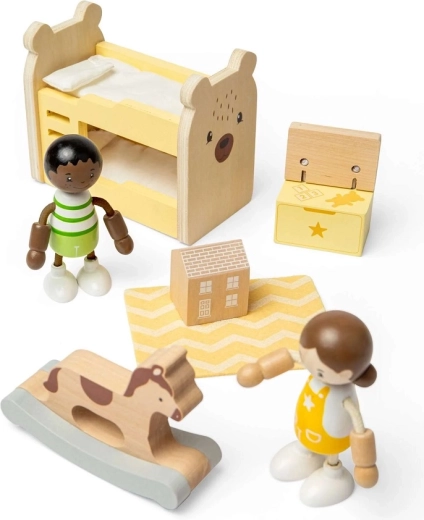 Ez a gondosan megmunkált bútorkészlet bármely babaházat hangulatos gyerekszobává változtat, tele fantáziával. A gyerekek elaltathatják a babákat a emeletes ágyban, hintáztathatják a hintalovon, elrejthetik kincseiket a játékládába, és berendezhetik a szobát a kiegészítőkkel, köztük a mintás szőnyeggel és a mini házikóval.