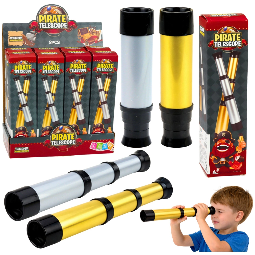 A 12×30 mm-es gyerek kalóztávcső nagyszerű kiegészítő a kis felfedezőknek. A valósághű, teleszkópos szerkezet könnyen kihúzható és visszatolható, ami fokozza a játék élményét és ösztönzi a kreatív jeleneteket. A könnyű és strapabíró műanyag kényelmes használatot biztosít hosszabb játék közben is.