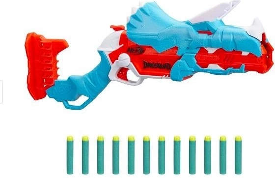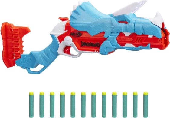 A blaster a népszerű Triceratopsz dinó formájában lett kialakítva. Egyedi kialakítása szórakozást biztosít a dinoszauruszok világában, amit a gyerekek imádnak.