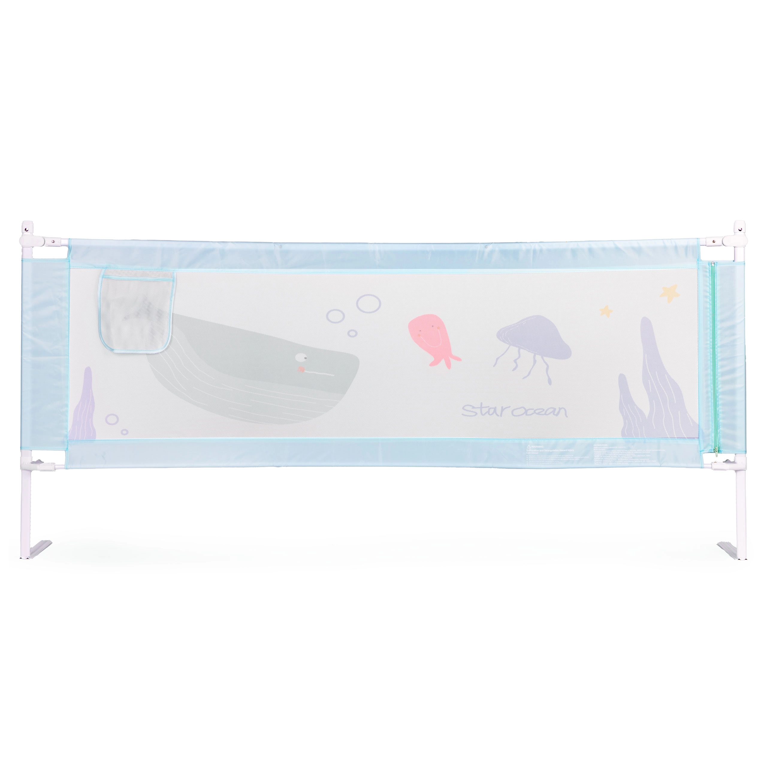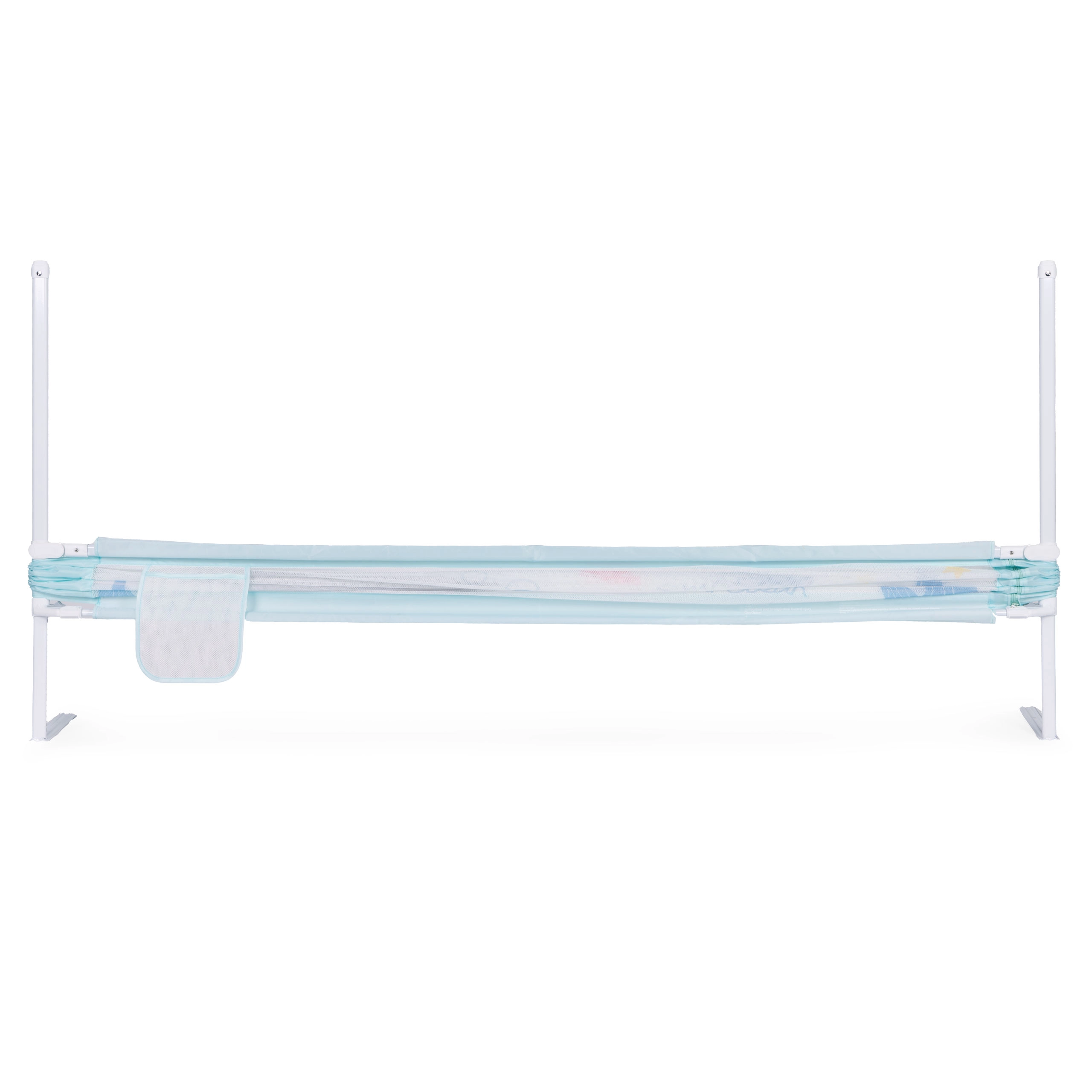 A univerzális rögzítésnek köszönhetően a korlát az ágy bármelyik élére felszerelhető, és több elem összekapcsolható biztonságos egésszé. A tartós anyagok – acél, minőségi 210D Oxford szövet és poliészter – garantálják a stabilitást és a hosszú élettartamot. A praktikus zseb kéznél tartja a cumit, zsebkendőt vagy a kedvenc játékot.