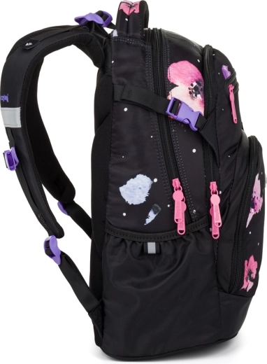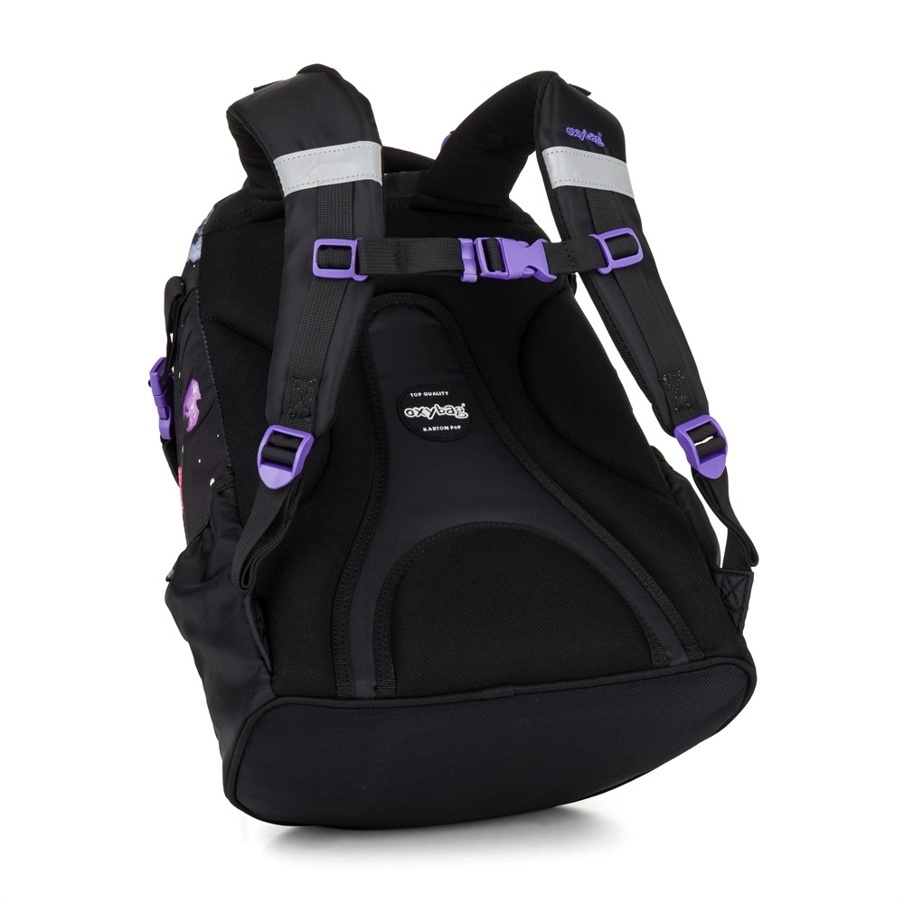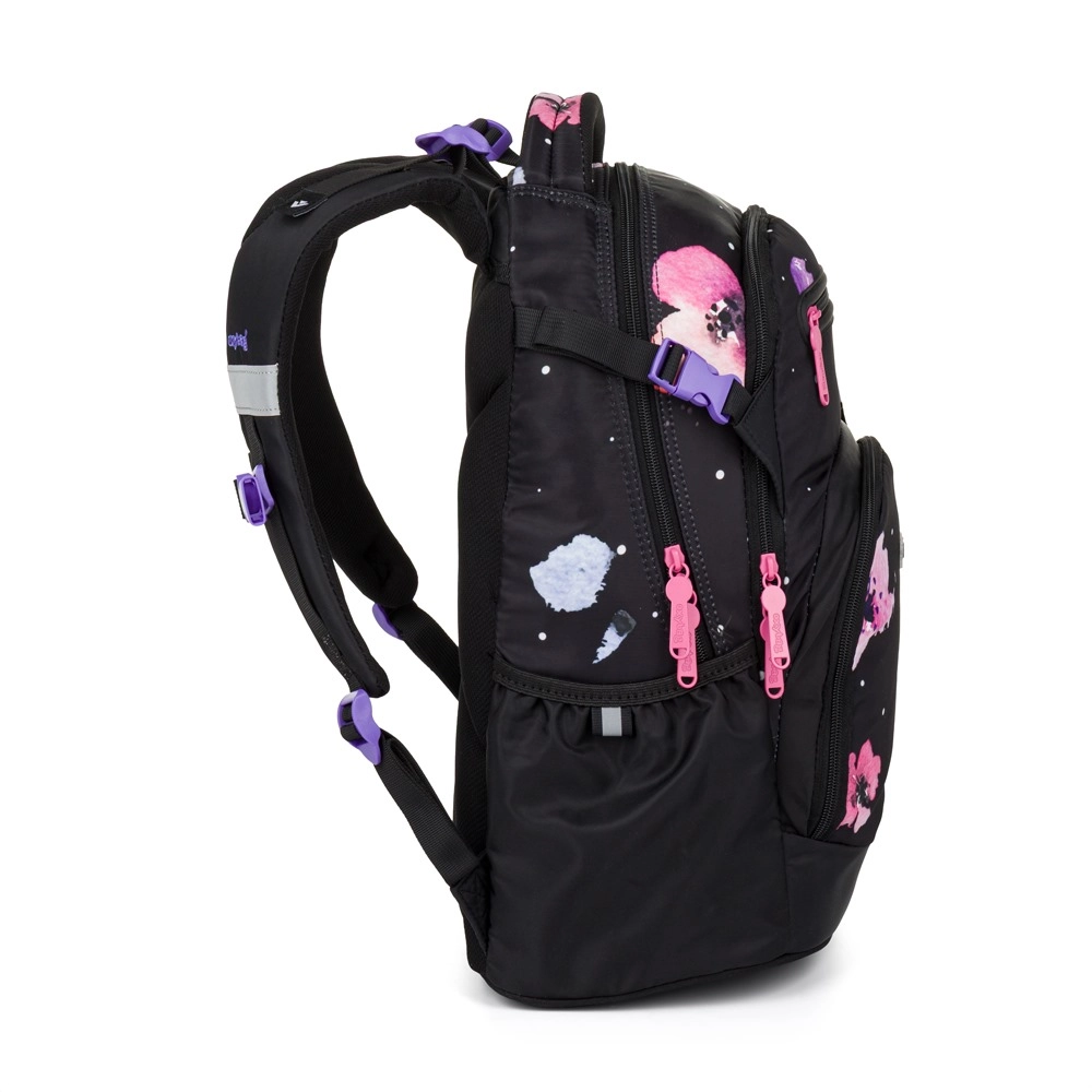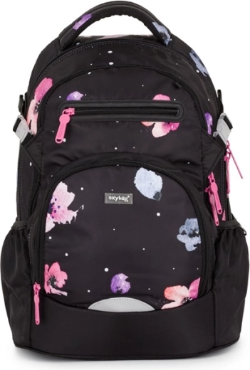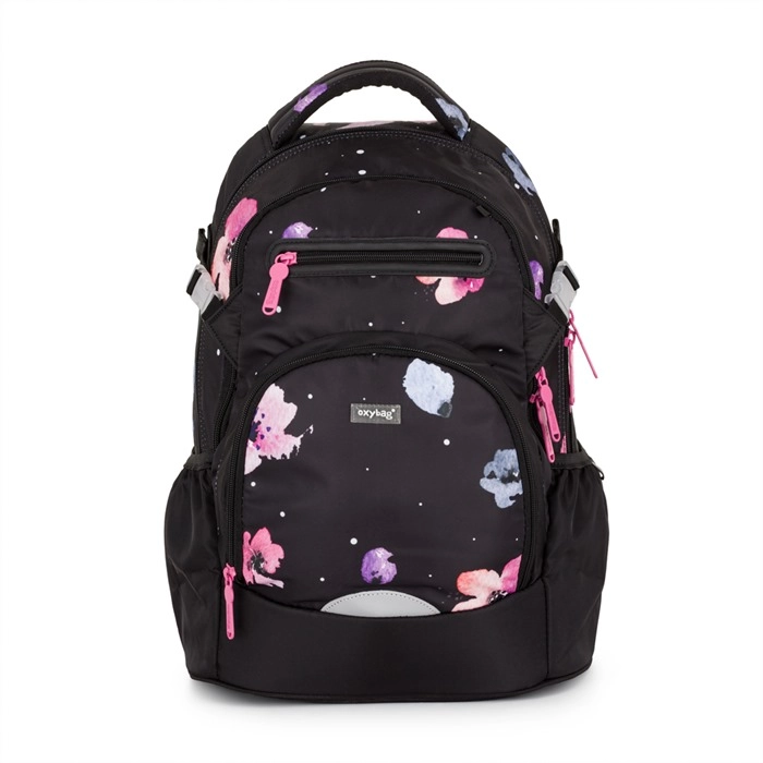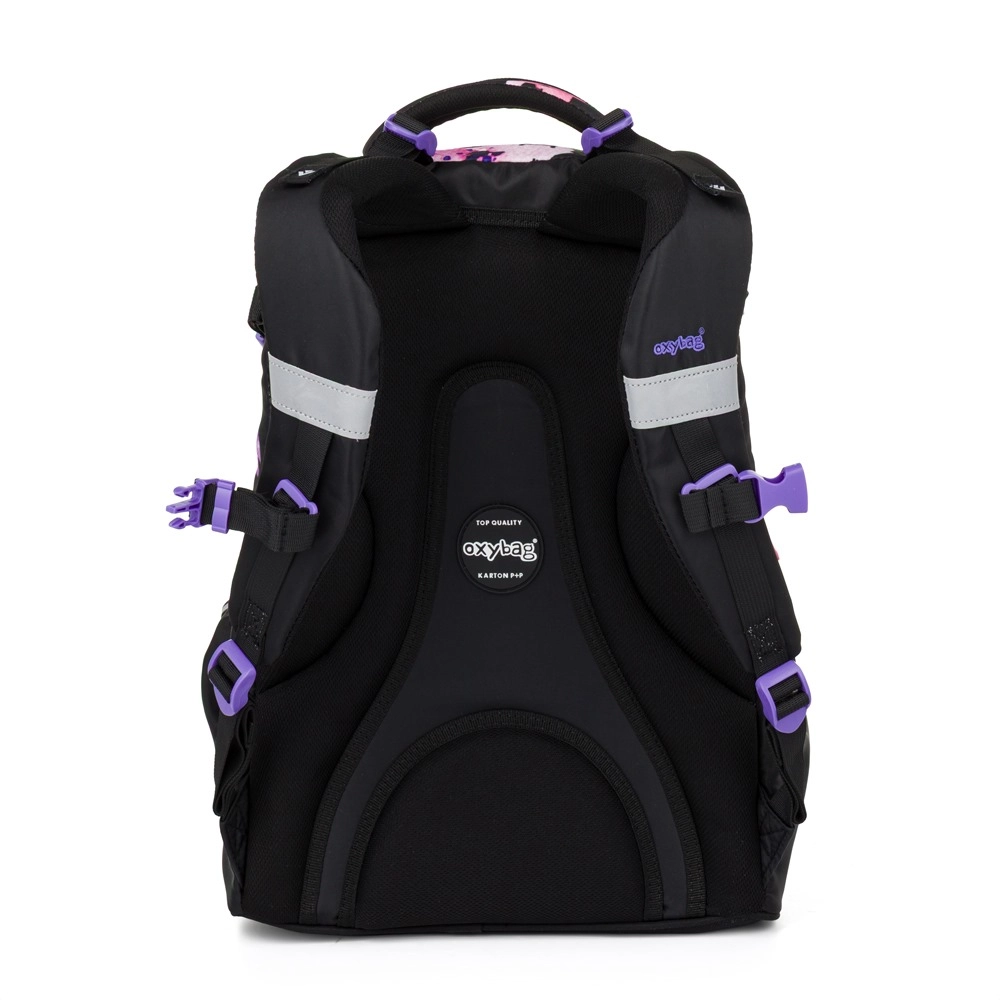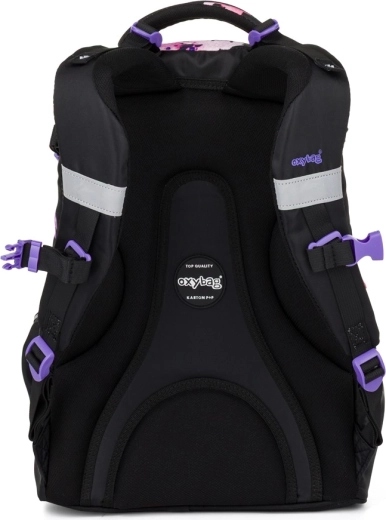 Az OXY Ombre Flowers iskolai hátizsák a 3. osztálytól kezdődő mindennapos kényelmes viseletre készült. A ergonomikus hátpanelnek (43 cm hossz) és a puhán párnázott vállpántoknak köszönhetően kiválóan alkalmazkodik a gyermek hátához. Az állítható mellpánt a helyén tartja a pántokat, míg a merev, stabil alj megakadályozza a felborulást és védi a tartalmat.