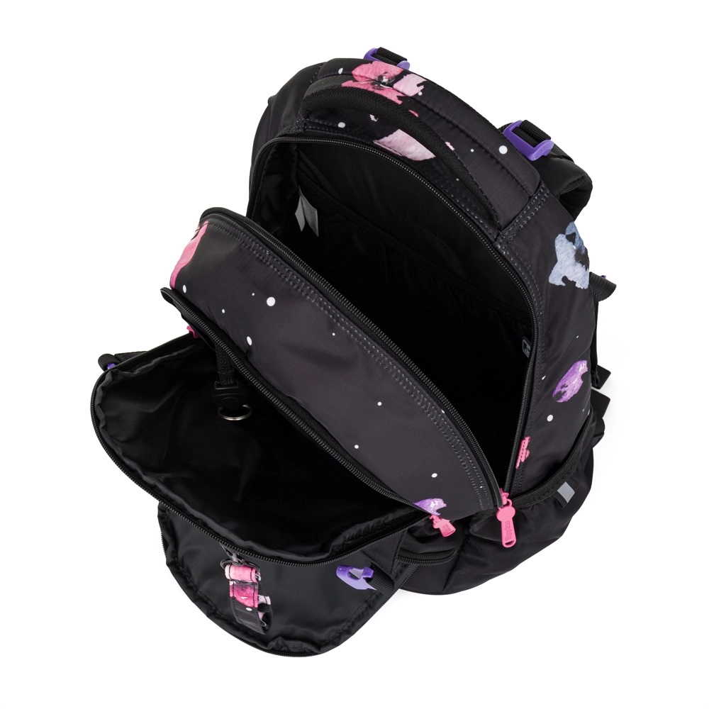 Két tágas rekesz tankönyveknek és füzeteknek, elülső zseb apróságoknak vagy uzsonnának, valamint oldalsó rugalmas zsebek italospalack számára a gyors hozzáféréshez.
