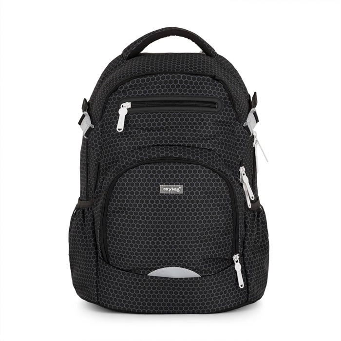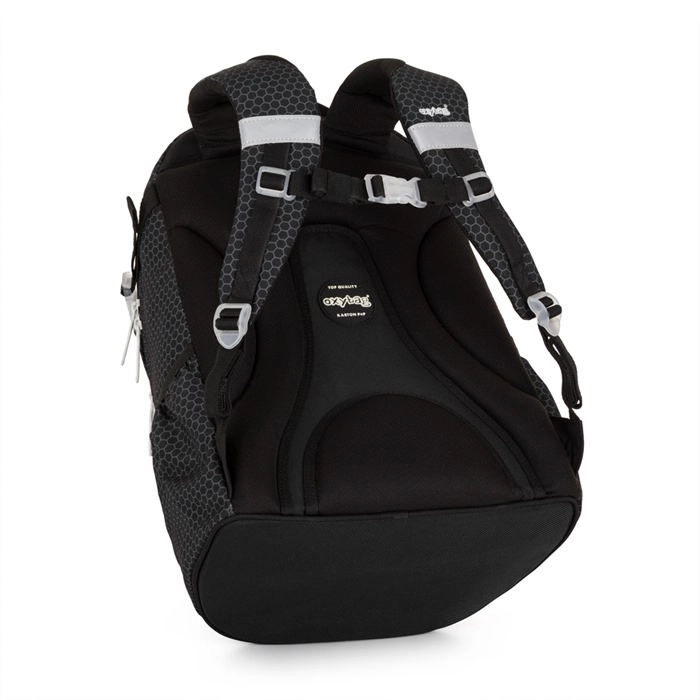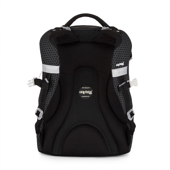 Az OXY Ombre fekete iskolatáska úgy készült, hogy 3. osztálytól kényelmet, rendszerezettséget és biztonságot nyújtson az iskolába vezető úton. Az ergonomikusan formázott, 43 cm hosszú hátpanel, a párnázott pántok és az állítható mellpánt egészséges teherelosztást és kényelmet biztosít a mindennapi viselés során.