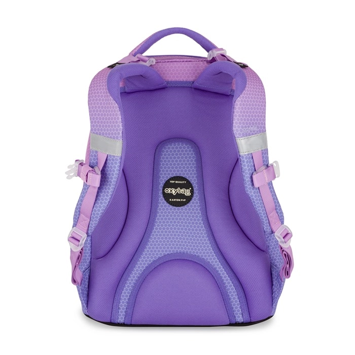 Stílusos OXY Ombre iskolatáska rózsaszín–lila kivitelben, ideális 3. osztálytól. Kínál anatómiailag formázott hátpanelt, párnázott vállpántokat és állítható mellpántot a kényelmes viseléshez. A merev aljnak köszönhetően stabilan áll, két tágas rekesszel, oldalsó kulacstartó zsebekkel, elülső uzsonnás zsebbel és fényvisszaverő elemekkel rendelkezik a nagyobb biztonságért.