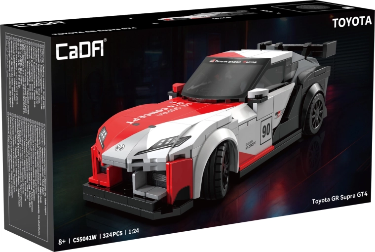 A CaDA sorozat ezen statikus modellje hűen visszaadja a TOYOTA GR Supra GT4 agresszív sziluettjét és aerodinamikus vonalait. Az építőkészletet szórakoztató építésre, polcos kiállításra és könnyed játékra tervezték a gördülő kerekeknek köszönhetően. Az elemekre nyomtatott minták kiemelik a valósághű versenyelemeket, beleértve a spoilert és a rajtszámot is.