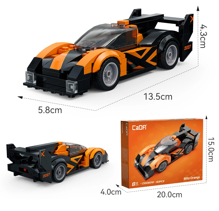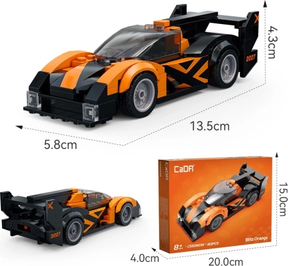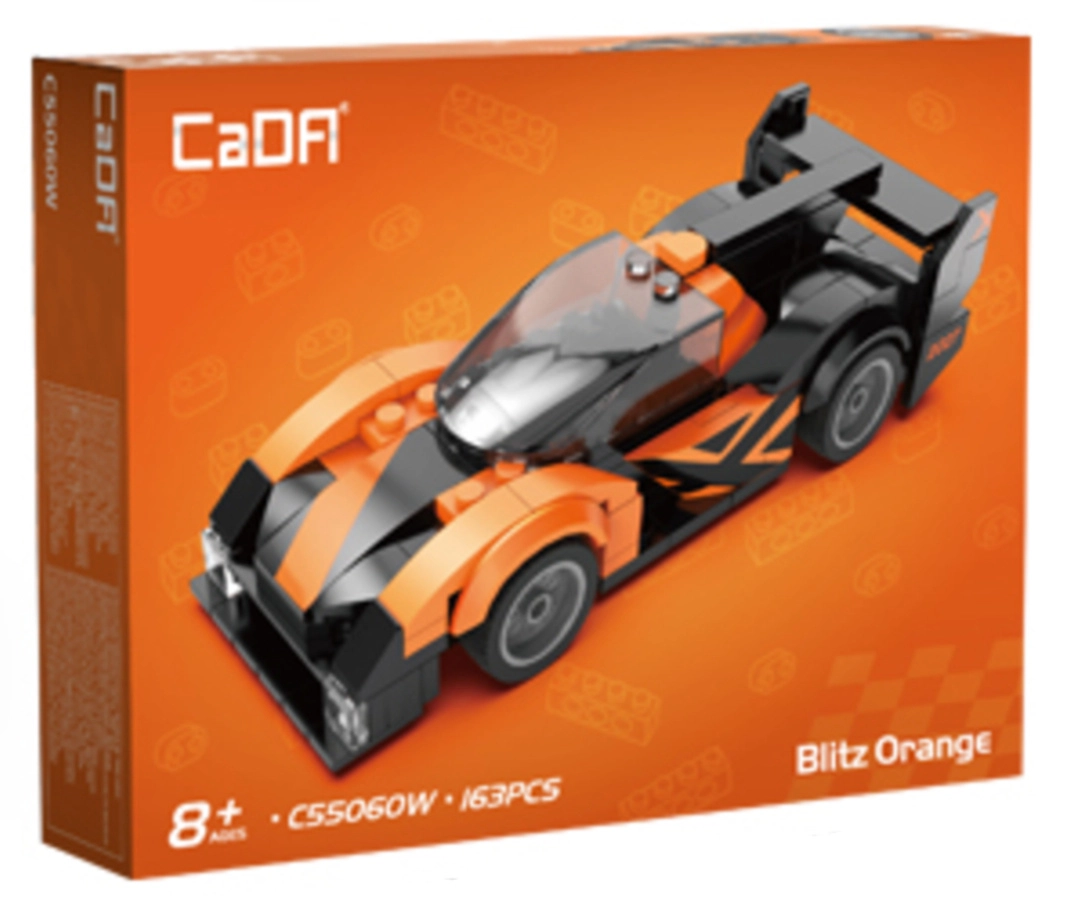 A CaDA Blitz Orange versenyautó minden építést és gyors autókat kedvelőnek örömet szerez. A 163 precízen illeszkedő kockának köszönhetően kompakt modellt állíthatsz össze aerodinamikus formával, átlátszó kabinnal és feltűnő lámpákkal. A működő kerekeknek hála a modell könnyedén gurul a sík felületen – ideális játékhoz és kiállításhoz.
