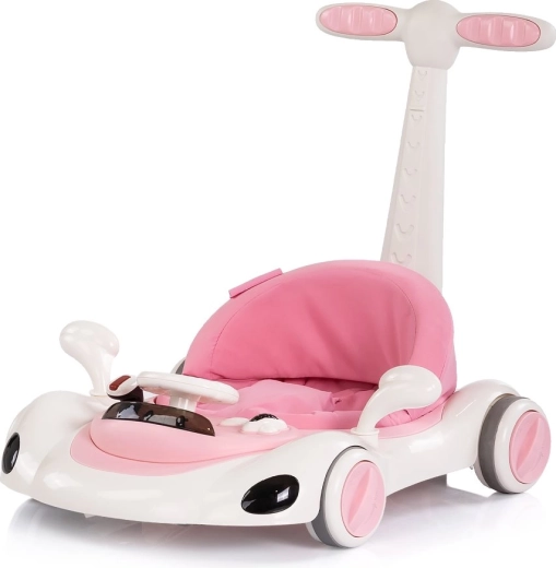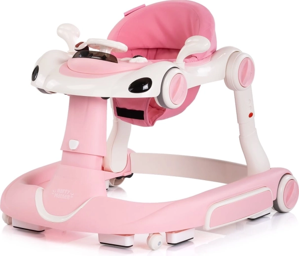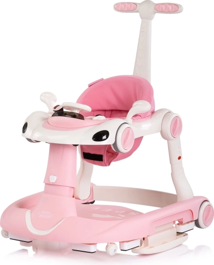 A CHIPOLINO Happy Walker 5 az 1-ben univerzális bébijáró rózsaszín színben támogatja az első lépéseket és a világ vidám felfedezését. Kínál stabil szerkezetet, interaktív játékkonzolt fénnyel és zenével, állítható magasságot, valamint szülői tolókarot a biztonságos irányításhoz. A hintázó és ugráló üzemmódnak, a csúszásgátló tappancsoknak, a fékrendszernek és a kerekek rögzítésének köszönhetően alkalmas a mindennapi használatra, és fejleszti az egyensúlyt, a koordinációt és a motorikát.